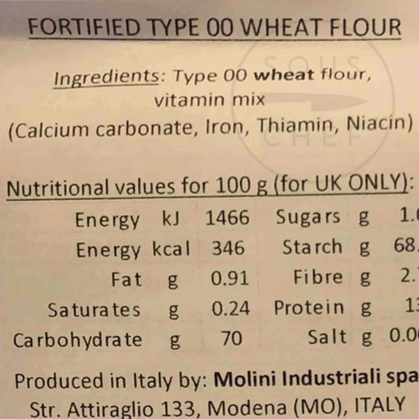 Product formulations and details may change. For the latest ingredients and allergen information always check product packaging prior to consumption. Ingredients: Type 00 wheat flour, vitamin mix (calcium carbonate, iron, thiamin, niacin)