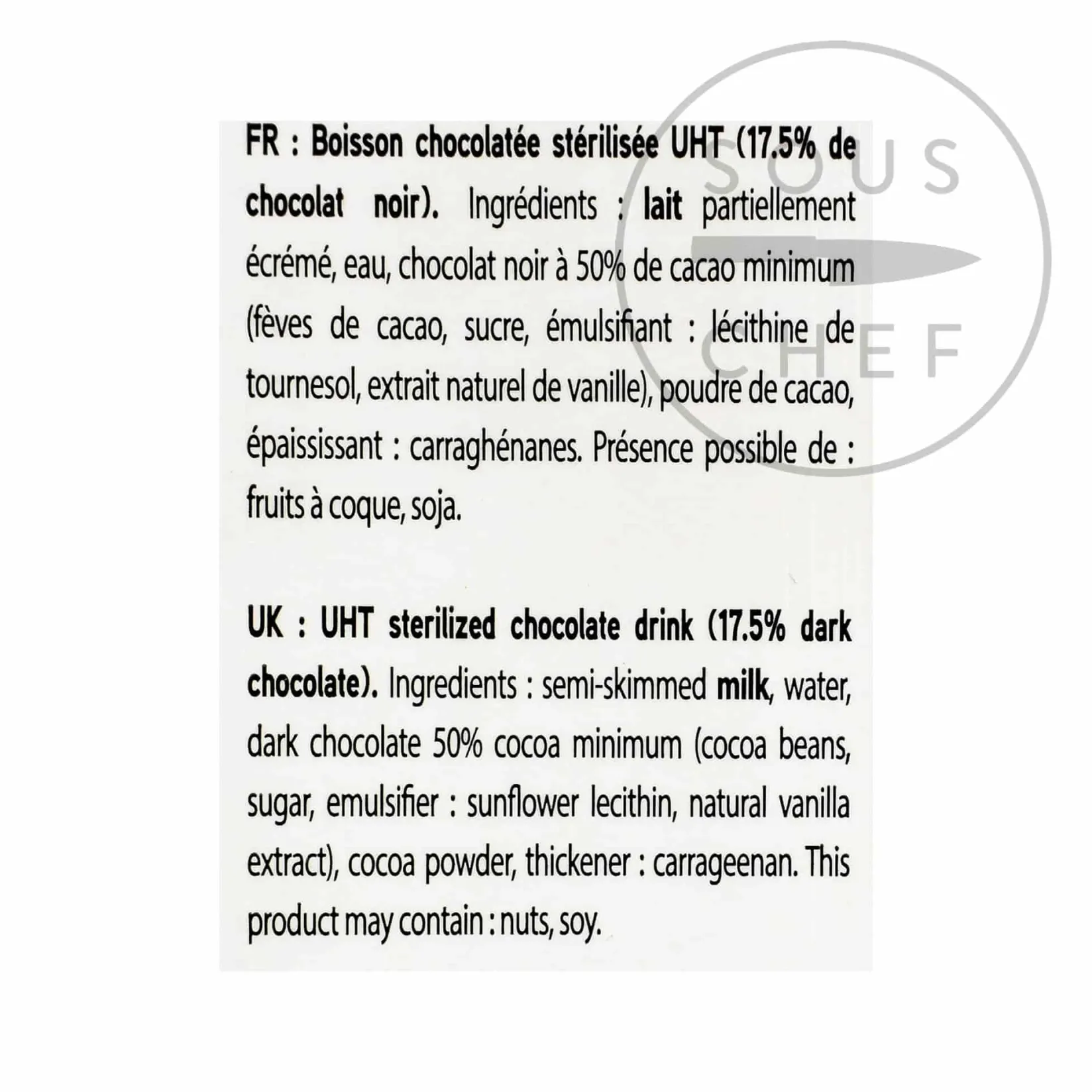 Product formulations and details may change. For the latest ingredients and allergen information always check product packaging prior to consumption. Ingredients: semi-skimmed milk, water, dark chocolate 50% cocoa minimum (cocoa beans, sugar, emulsifier: sunflower lecithin, natural vanilla extract), cocoa powder, thickener: carrageenan. May contain nuts & soy.