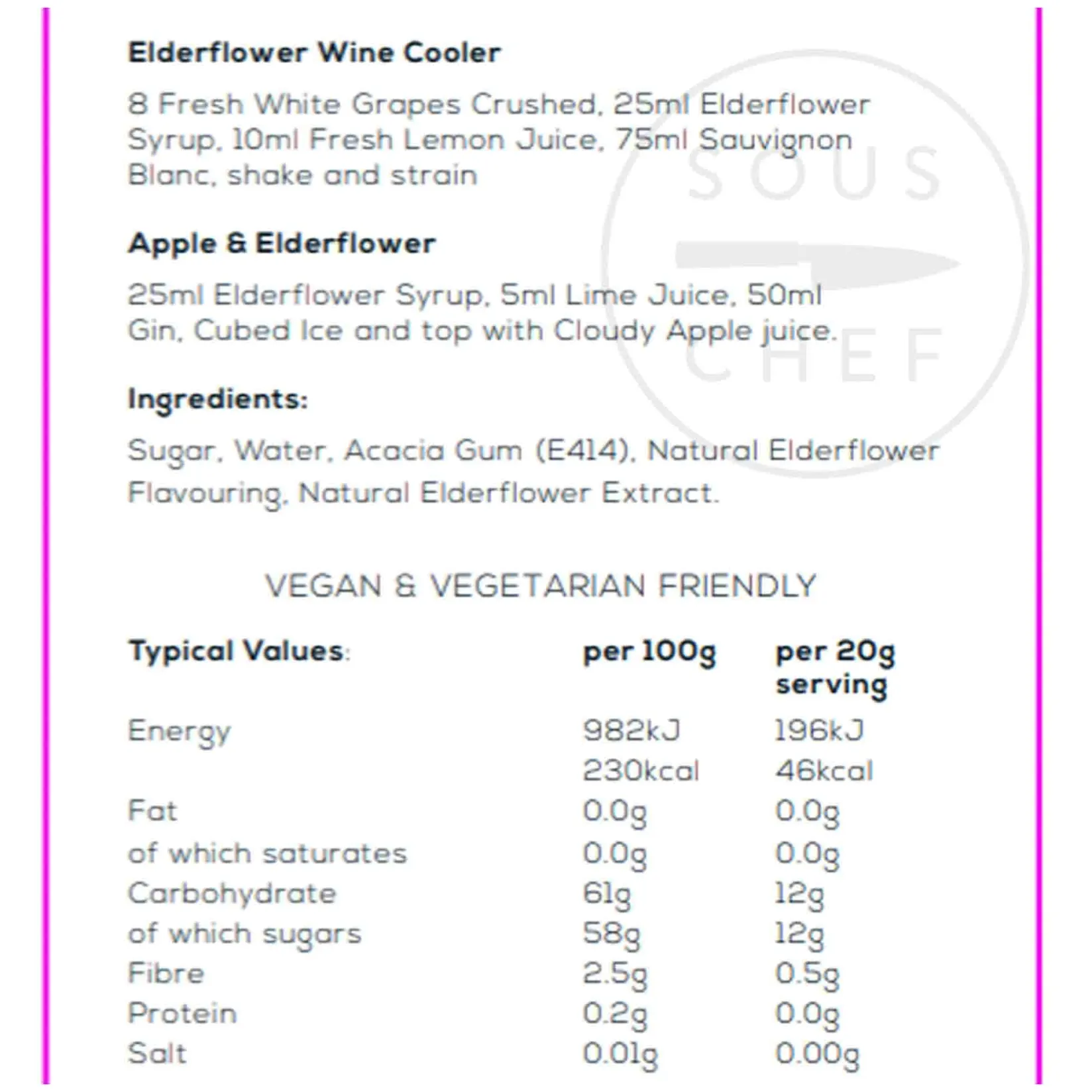 Product formulations and details may change. For the latest ingredients and allergen information always check product packaging prior to consumption. Ingredients: Sugar, water, emulsifier: acacia gum (E414), flavourings: natural elderflower flavouring