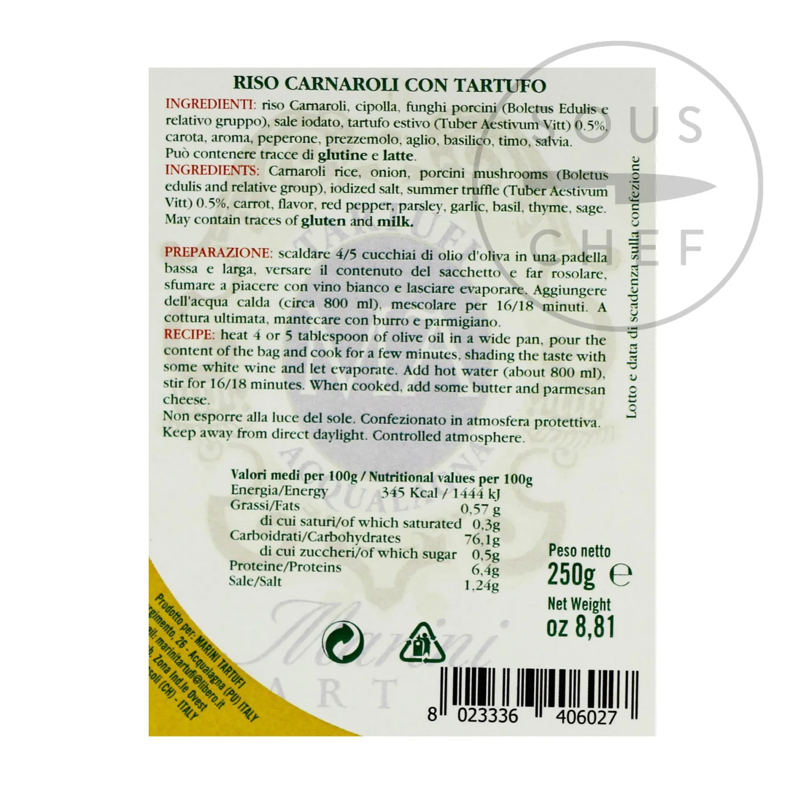 Product formulations and details may change. For the latest ingredients and allergen information always check product packaging prior to consumption. Ingredients: Carnaroli rice, onion, porcini mushrooms (boletus edulis and relative group), iodized salt, summer truffles (tuber aestivum vitt) 0.5%, carrot, flavor, red pepper, parsley, garlic, basil, thyme, sage. May contain traces of gluten and milk.