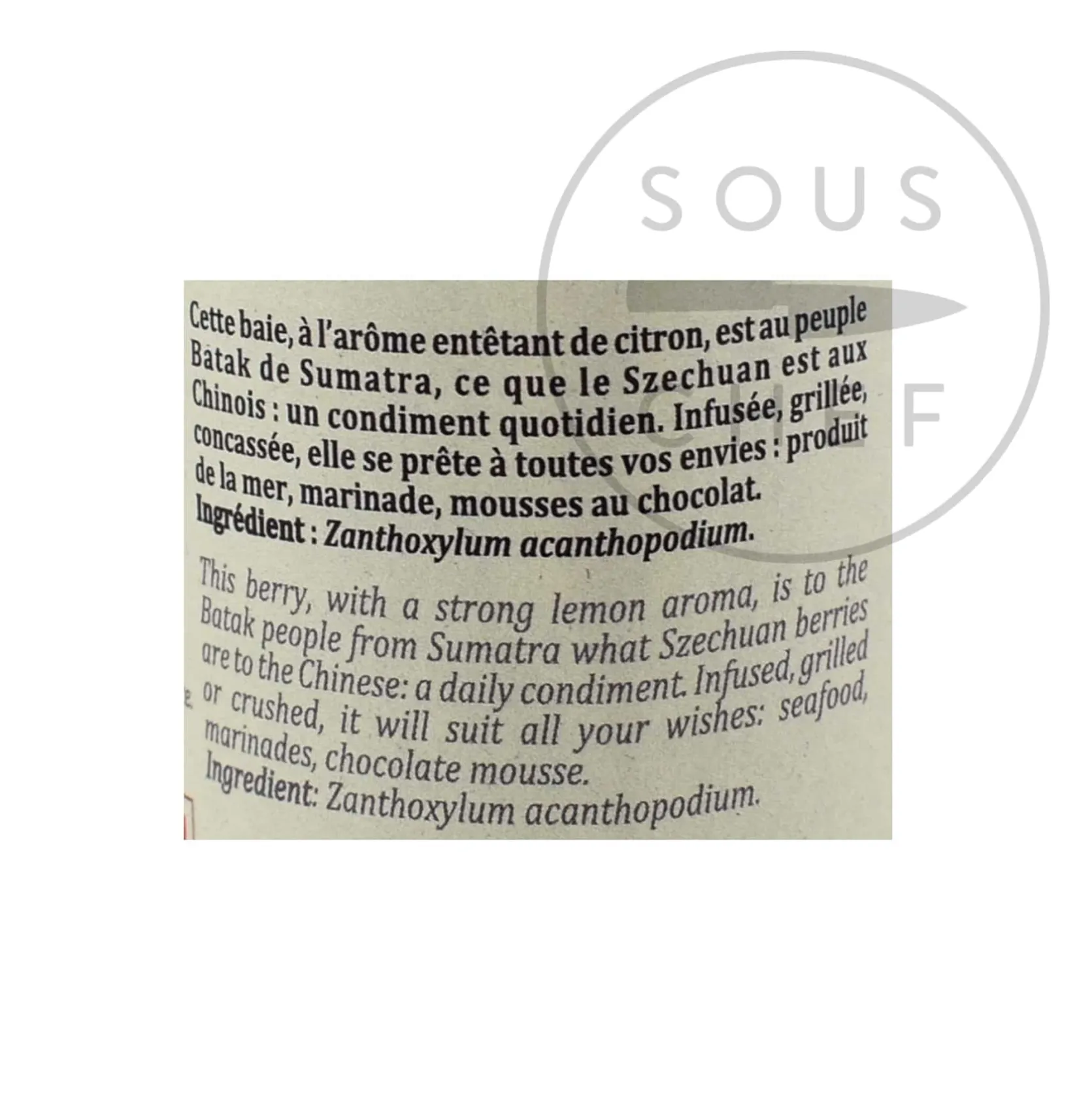 Terre Exotique’s Batak berry has heady lemon aromas – the Batak equivalent of Chinese Szechuan berry. Harvested in Indonesia by the Batak people, these berries grow in the zanthoxylum acanthopodium bush and are related to Szechuan berries. Also known as Bataks pepper, these berries are used in a traditional dish of Ikan mas arsik, made with wok-fried carps and a ginger & lemongrass sauce.