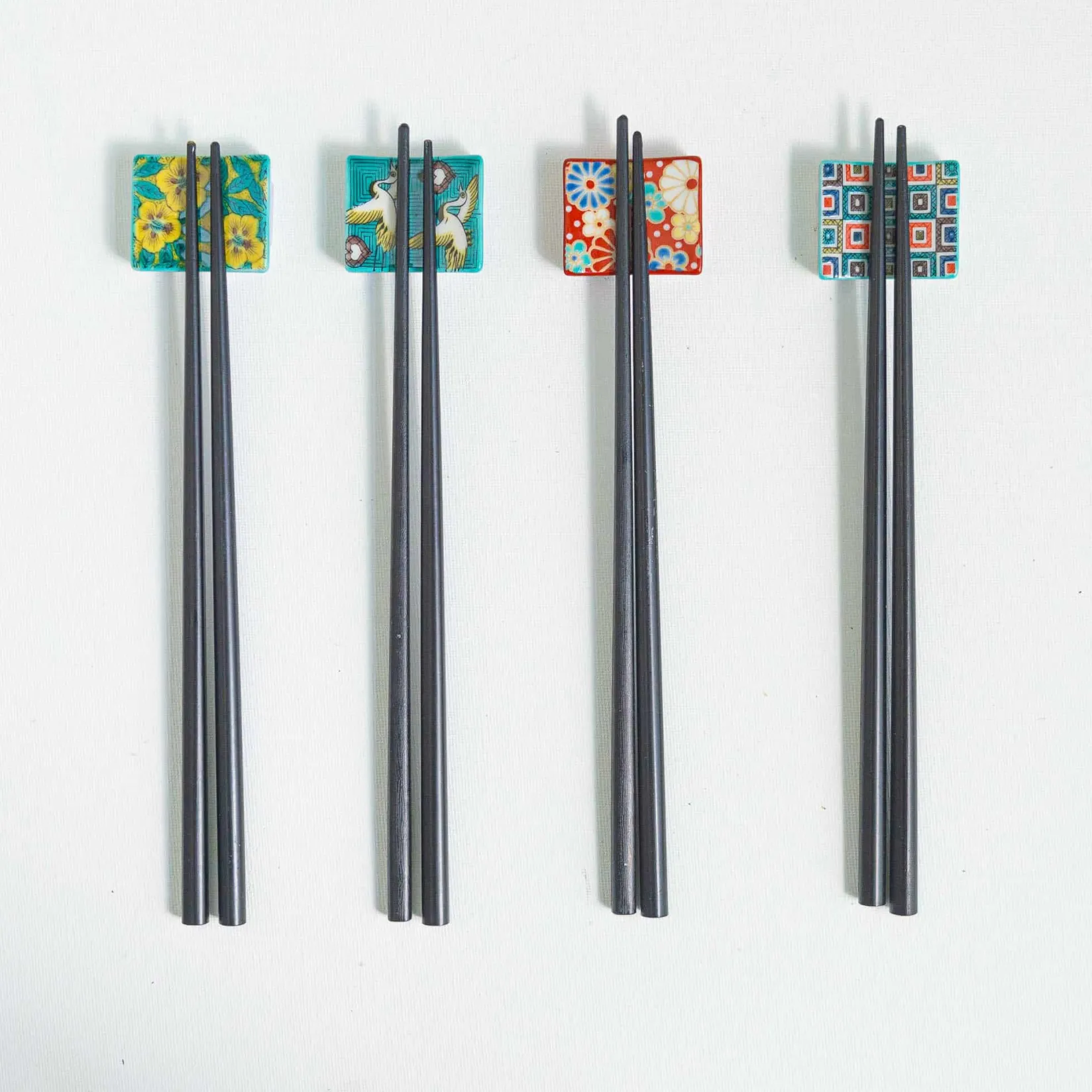 The Tsuru porcelain chopsticks rest is decorated with a pattern of flying cranes on a vibrant teal background. Made in Japan, the small square rest is a stylish and practical way to keep your table clean while you’re enjoying your meal. Simply place your chopsticks on the rest while you’re sipping sake or reaching for the last dumpling. Matching chopsticks are available to create an eye-catching dining set.