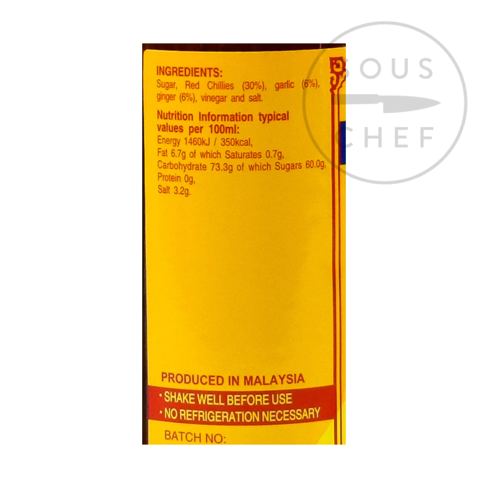 Product formulations and details may change. For the latest ingredients and allergen information always check product packaging prior to consumption. Ingredients: Sugar, Red Chillies (30%), garlic (6%), ginger (6%), vinegar and salt.
