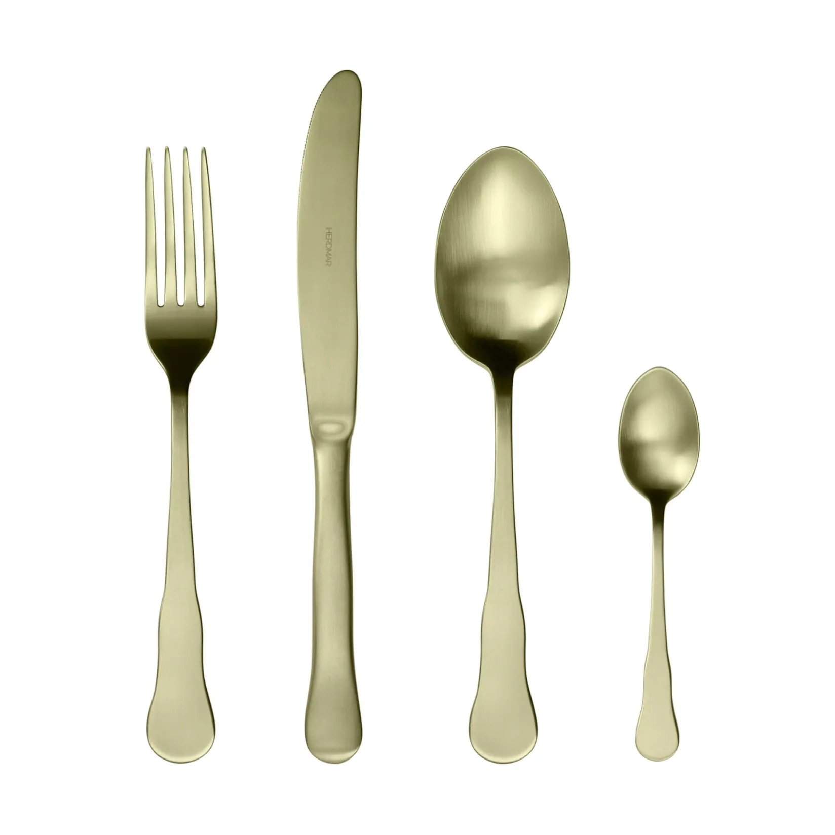 Dine like royalty with the Ambar Champagne cutlery set. The brushed finish and pale gold colour add instant glamour to your table. The set contains one place setting with a table knife, fork, table spoon & tea spoon. It’s ideal for entertaining or adding a little luxury to everyday meals.
