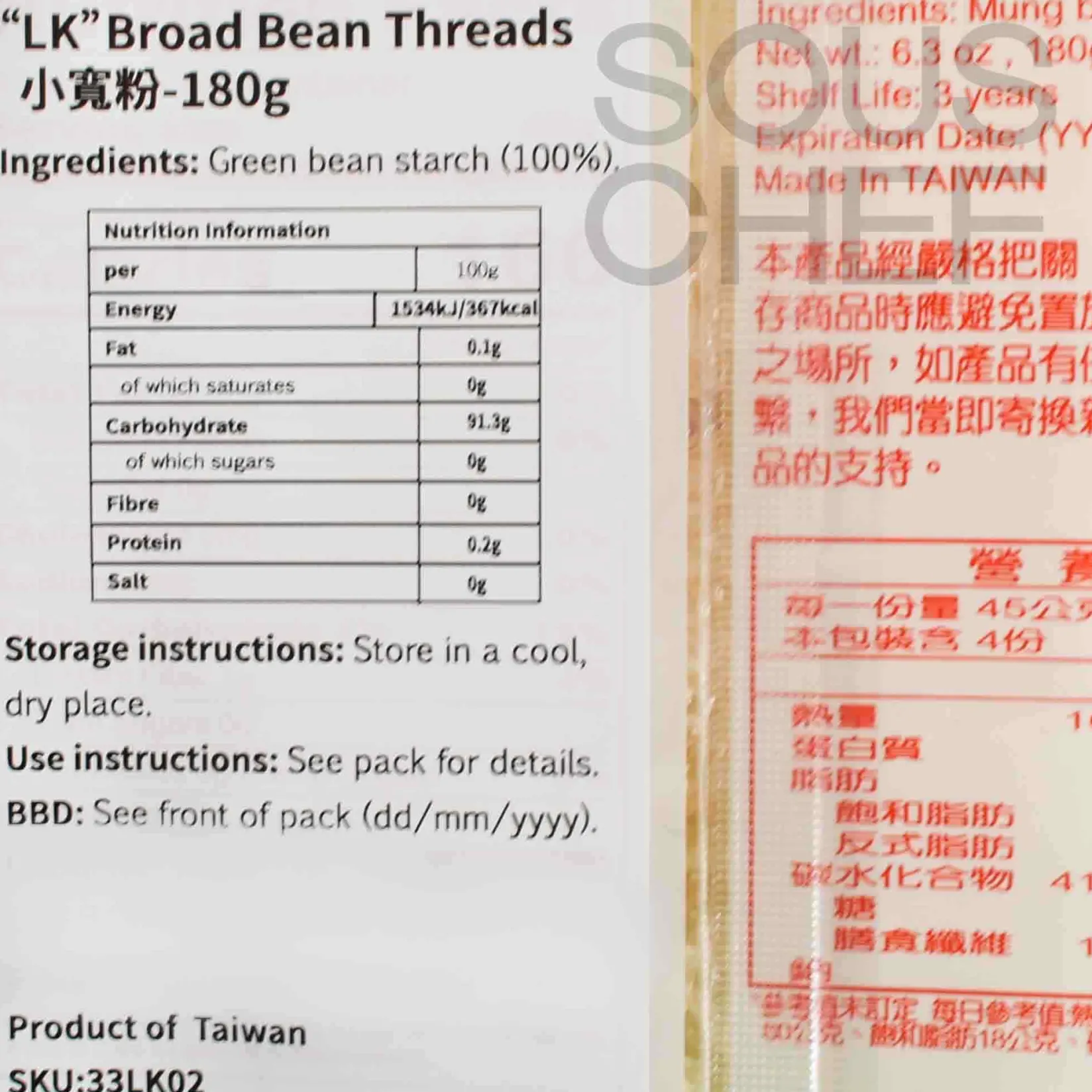 Broad bean threads are transparent noodles made from mung bean starch. They are also known as glass or cellophane noodles. These bean threads have a flat, wide shape similar to pad Thai noodles.