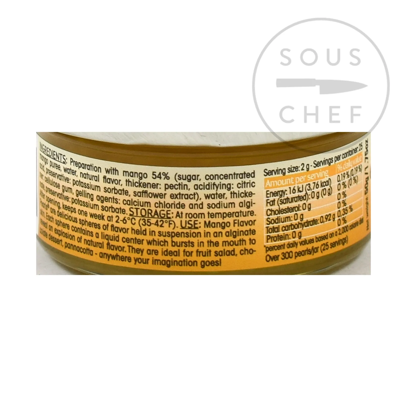 Enjoy mango flavour pearls with scallops, tuna tartare, or BBQ pork as a decorative, flavourful touch. Or add to a champagne cocktail, tomato salad or luxurious fruit dessert.