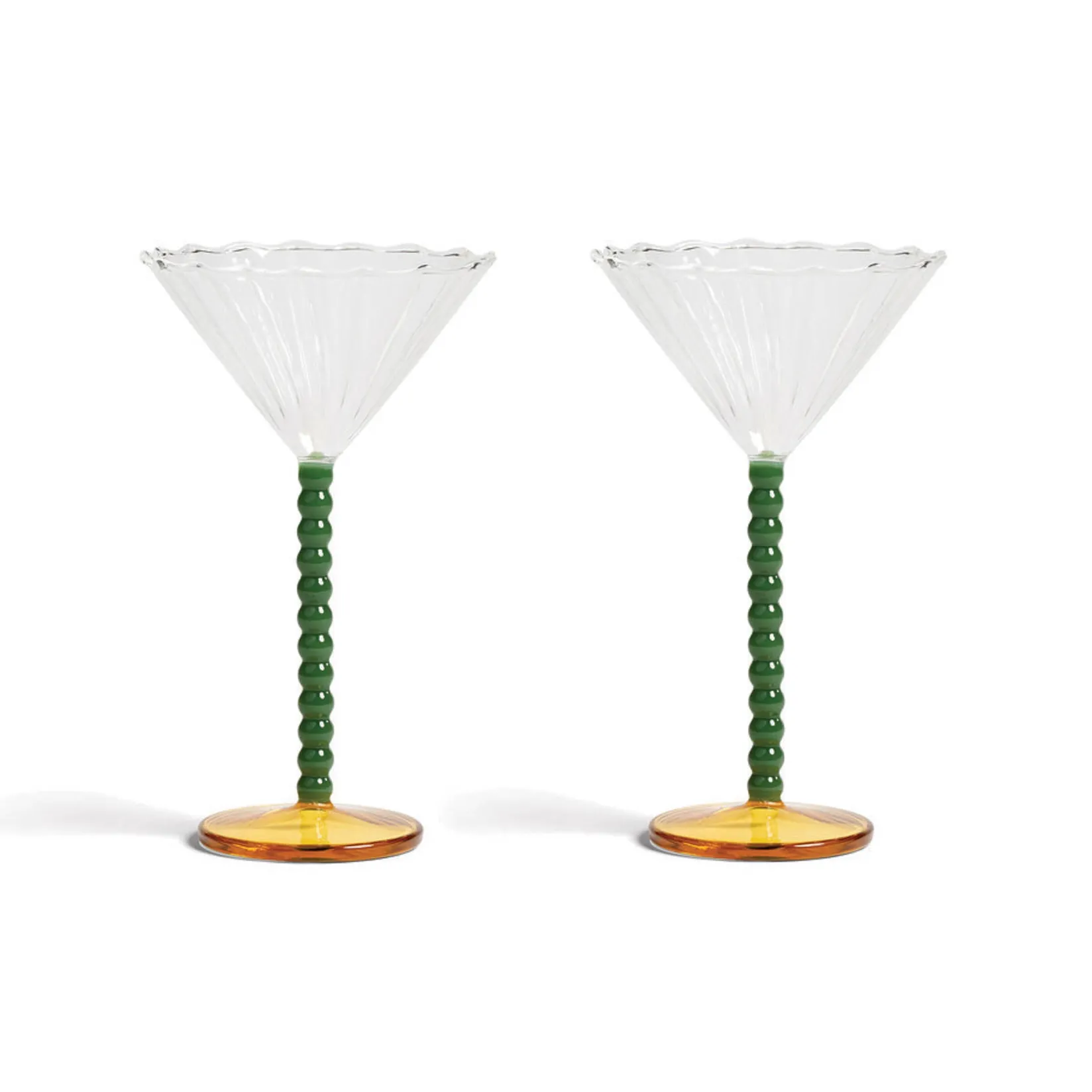 These bubble stem Martini glasses are a versatile and unique addition to your glassware collection. A Martini should always be served in an elegant glass and this modern pair is perfect for serving classic gin, potent espresso or fruity French Martinis. The green glass ‘bubble’ stem and amber base gives them a contemporary look – ideal for displaying on your bar cart.