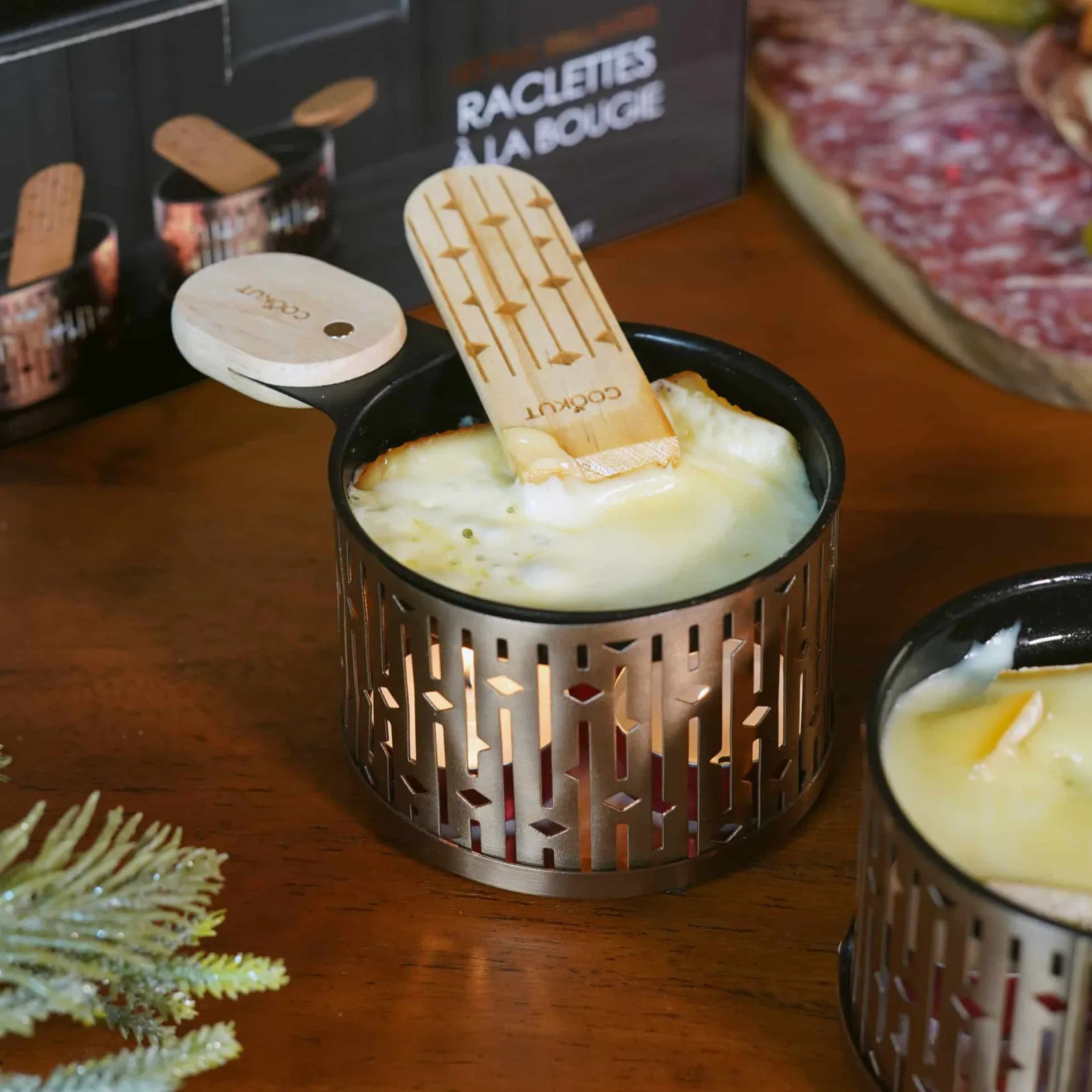 With Cookut’s copper raclettes, you can host a Swiss-inspired cheese party at home. Each metal burner has a non-stick melting pan and a wooden handle that stays cool once the candle is lit. The heat of the tealight candle will melt sliced cheese in minutes.