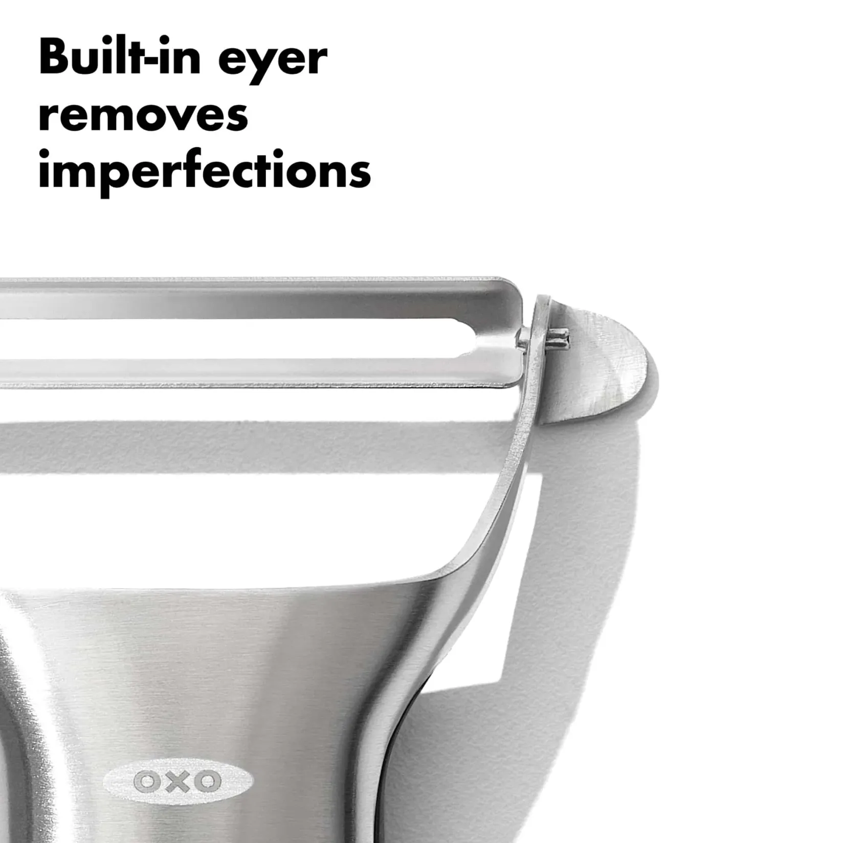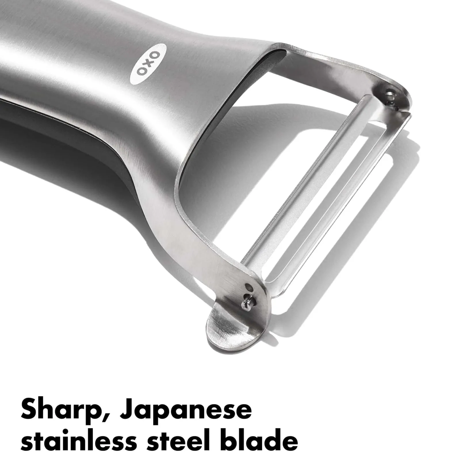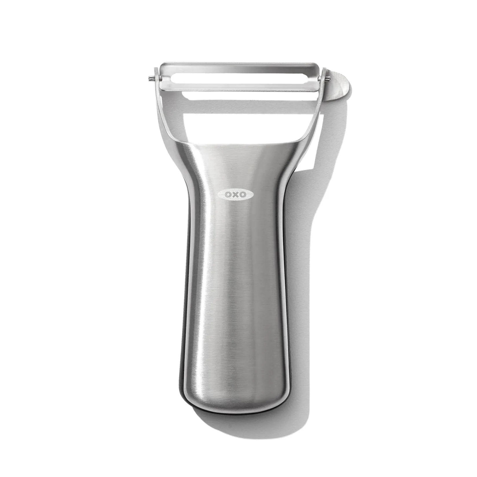 The Oxo stainless steel Y peeler prepares fruit and vegetables quickly and precisely. This peeler is made from high-quality stainless steel that cuts against food effortlessly for a smooth peel. Two sharp Japanese blades make light work of even the toughest vegetables in one stroke.