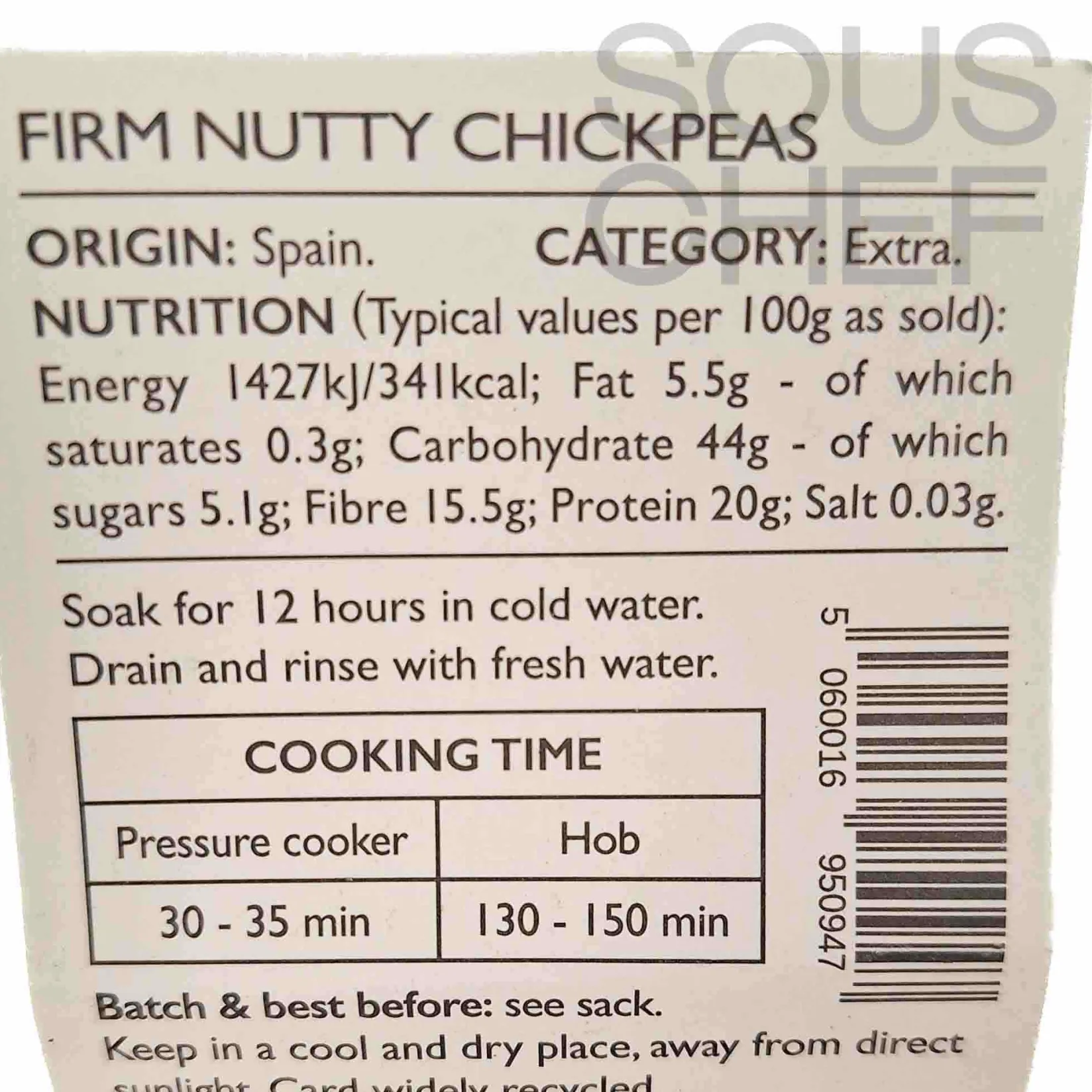 To cook the chickpeas, soak them in cold water for 12 hours. Drain and rinse with fresh water. They will cook in 130-150 minutes on the hob or 30-35 minutes in a pressure cooker.