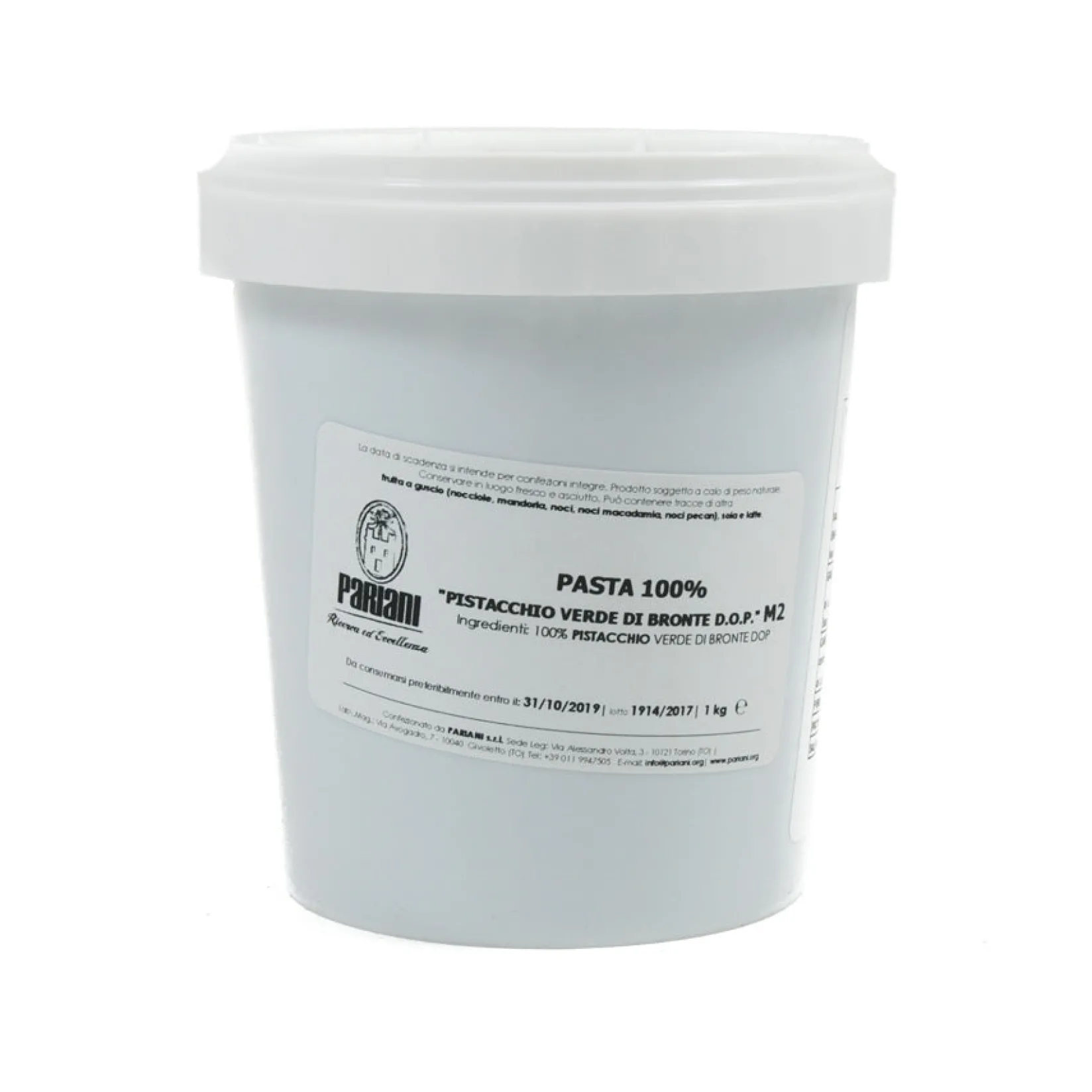 Bronte DOP pistachio paste is an ultra-smooth nut paste made with one of the world’s best varieties of pistachios. Bronte DOP pistachios are so sought after, they’re also known as Sicily’s ‘green gold’.