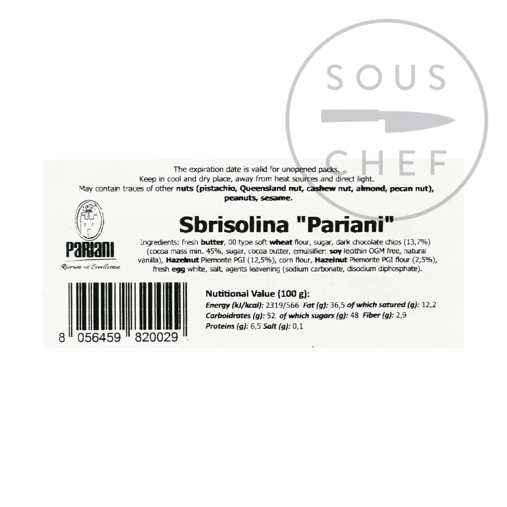 Pariani’s sbrisolina is the Piedmont version of the famous Mantova crunch cake sbrisolona. This version uses hazelnuts instead of almonds, and only the finest ‘Nocciola Piemonte PGI’ hazelnuts for a rich, slightly sweet flavour. This crunchy nut cake combines the hazelnuts with dark chocolate, a pinch of salt and a little lemon peel.