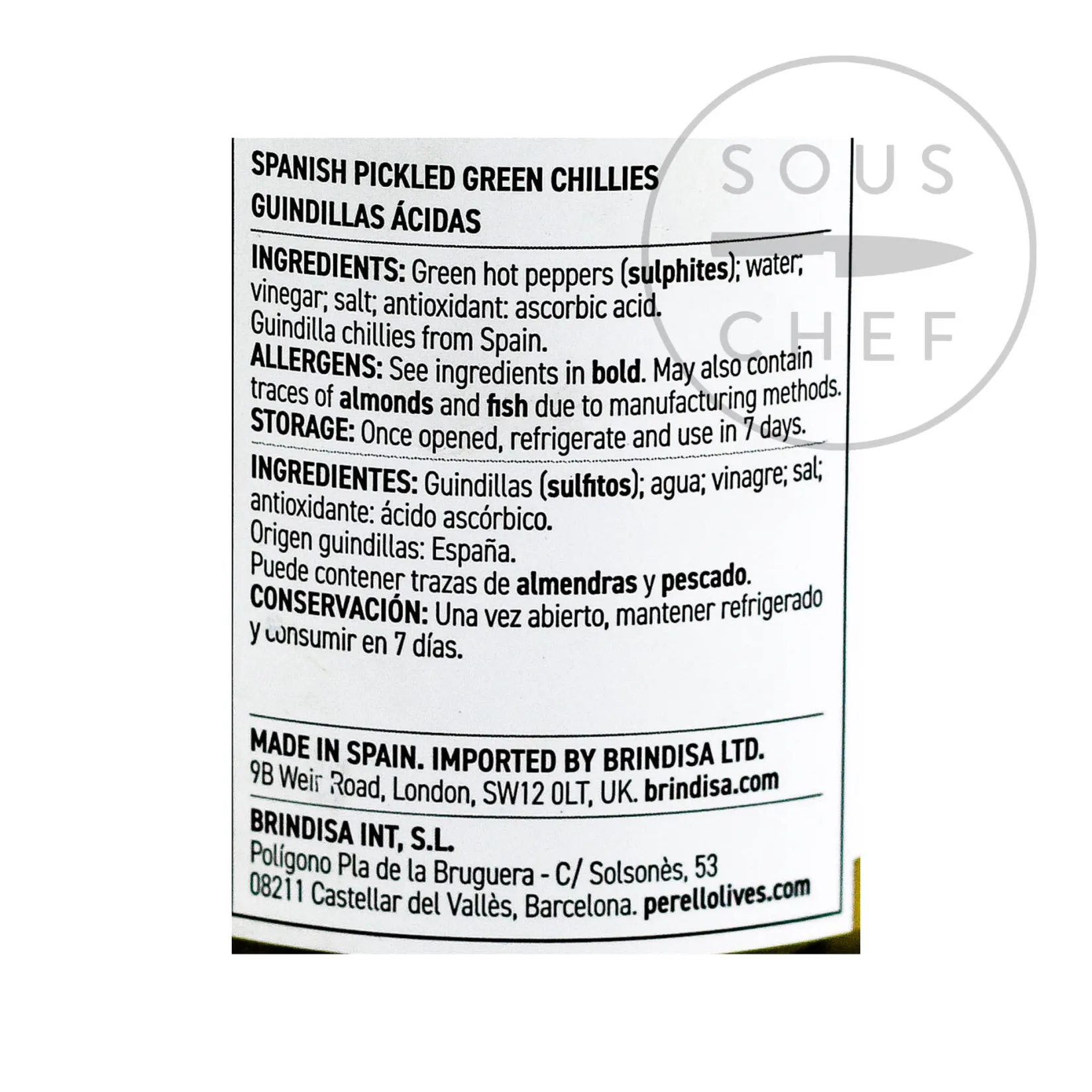 Perello Guindilla peppers are pickled in vinegar, giving these hot Spanish chillies a sharp tang. These long jarred chillies are a key ingredient in Gilda – a quintessentially Basque pintxo which combines Guindilla chillies with olives and anchovy fillets.