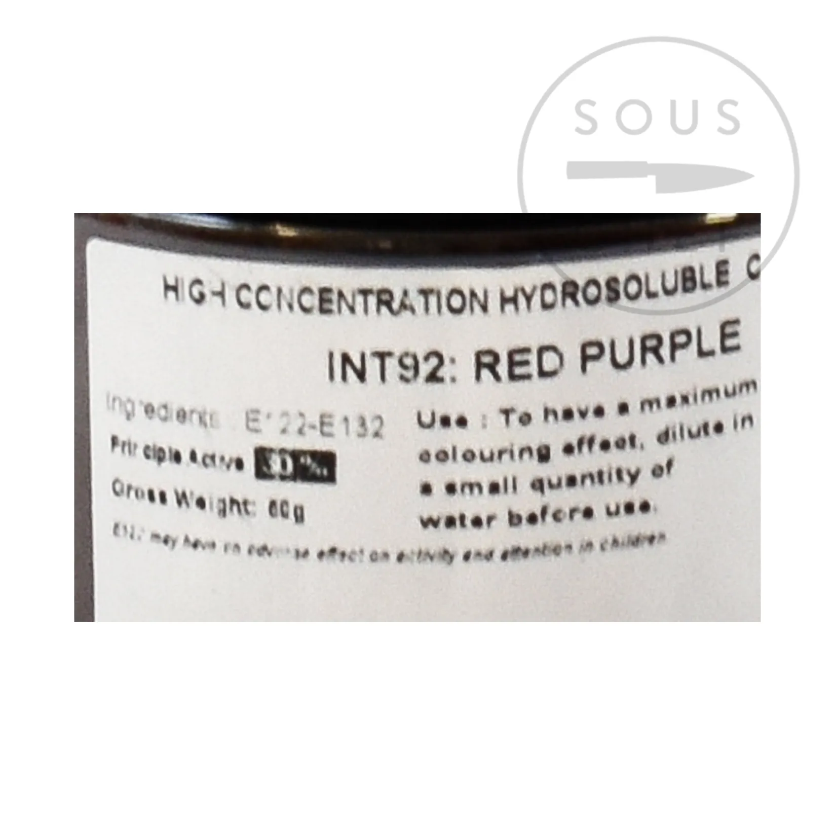 The intense red-purple food colour is water soluble. For maximum effect, dilute in a small amount of water before use. Recommended use is 1tsp of colouring in 1tsp water to colour 2kg of sugar. Contains 50g, or approx 60ml, or 12 tsp – enough for 24kg sugar.