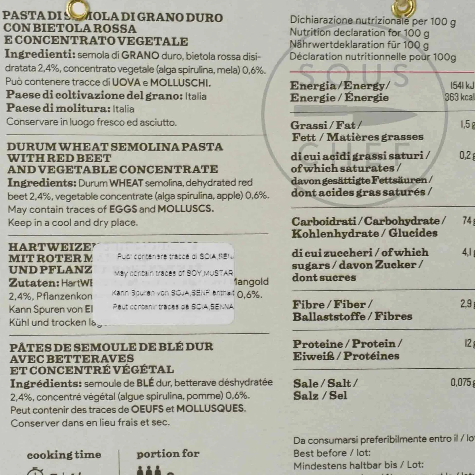 Product formulations and details may change. For the latest ingredients and allergen information always check product packaging prior to consumption. Ingredients: durum WHEAT semolina, dehydrated red beet 2,4%, vegetable concentrate (spirulina algue, apple) 0,6%