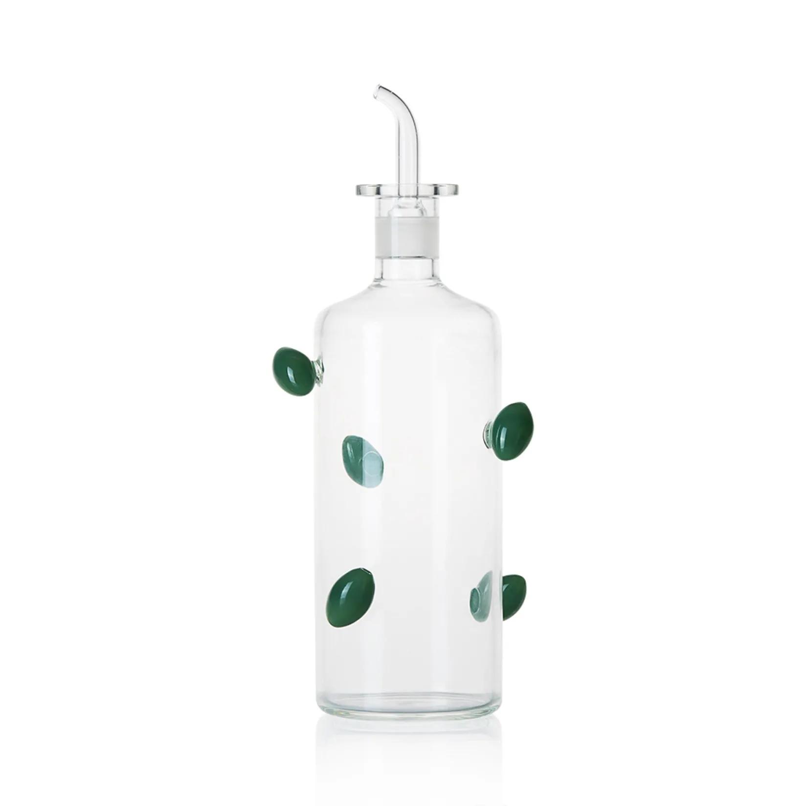 The bottle is made from hand blown borosilicate glass. It has a rounded body and a slender pouring spout. Fill it with golden olive oil to drizzle over salads and bruschetta. You can use it at the table or in the kitchen while you’re cooking.