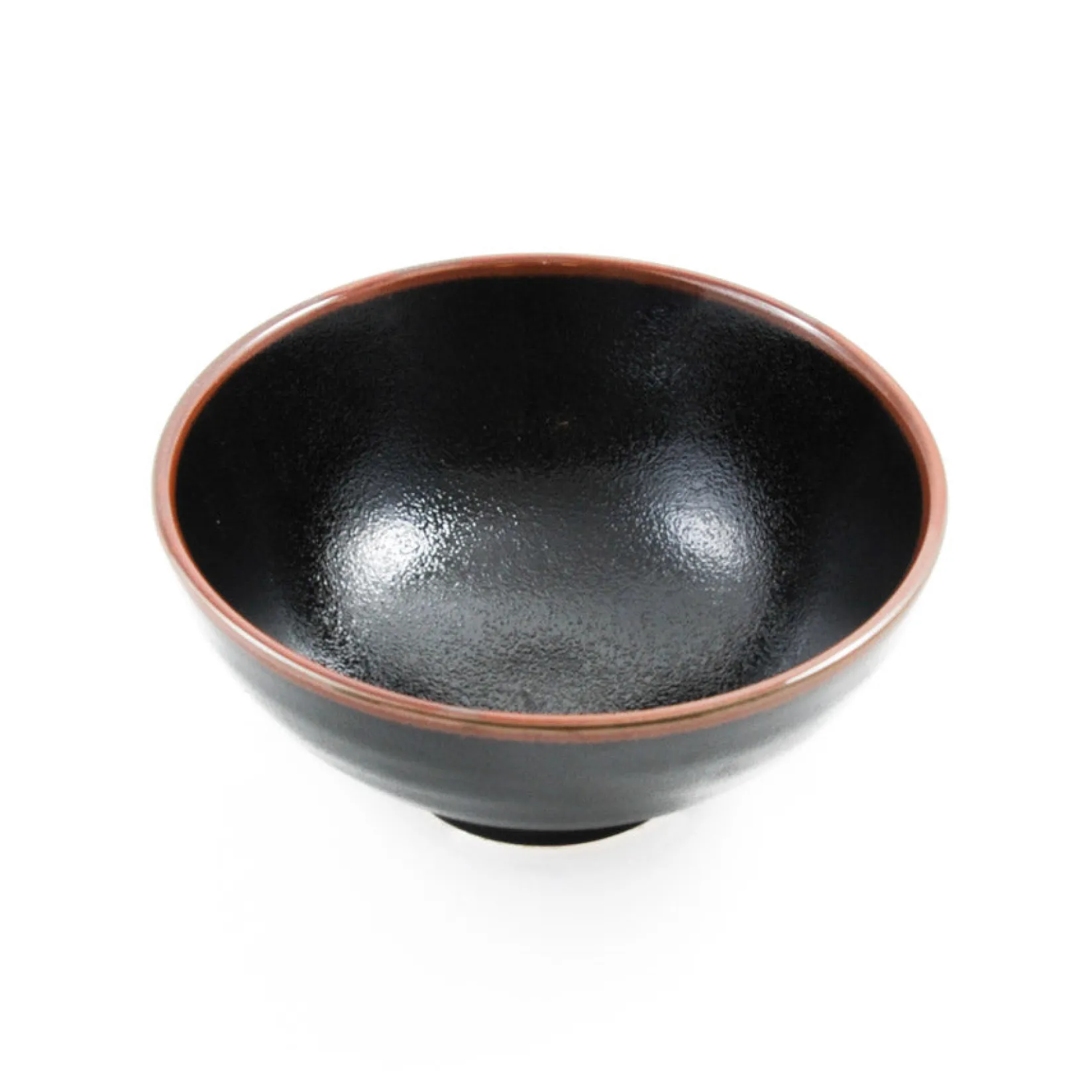 This black stoneware ramen bowl with a dimpled texture and brown rim makes for an attractive piece of tableware. The black glaze creates a dramatic background, working particularly well against both light food, such as rice dishes or chowders, and brightly-coloured soups or fresh salads.