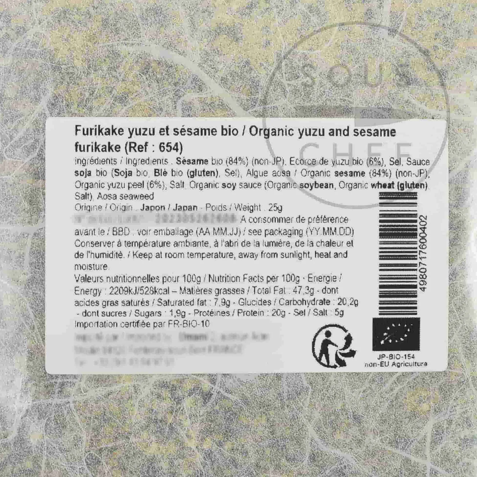 Product formulations and details may change. For the latest ingredients and allergen information always check product packaging prior to consumption. Ingredients: Organic sesame (84%), organic yuzu peel (6%), salt, organic soy sauce (organic soybean, organic wheat, sel), aosa seaweed