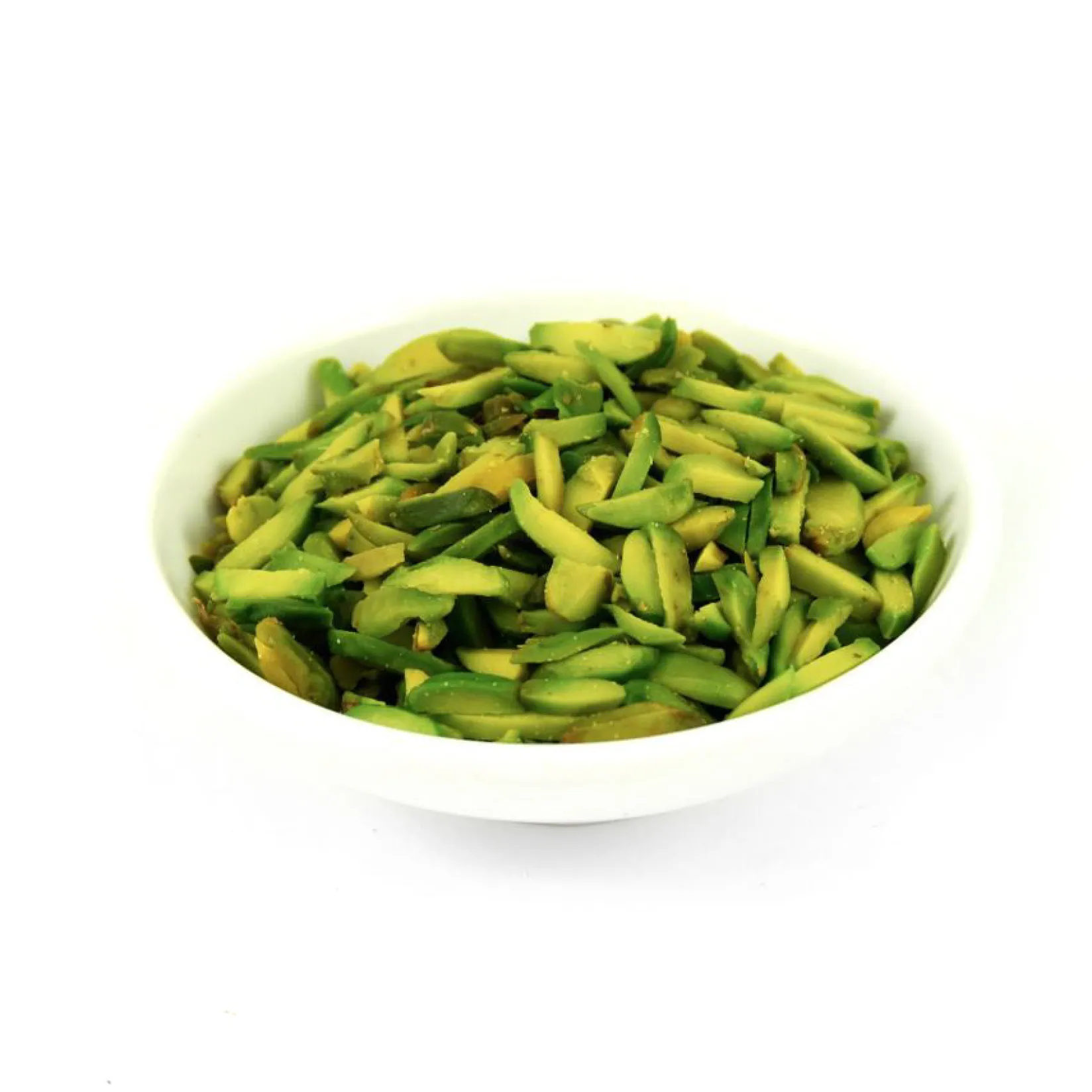 These green slivered pistachios are a beautiful bright green colour with a distinctive sweet, pistachio taste – perfect for sprinkling over sweet or savoury Middle Eastern dishes.