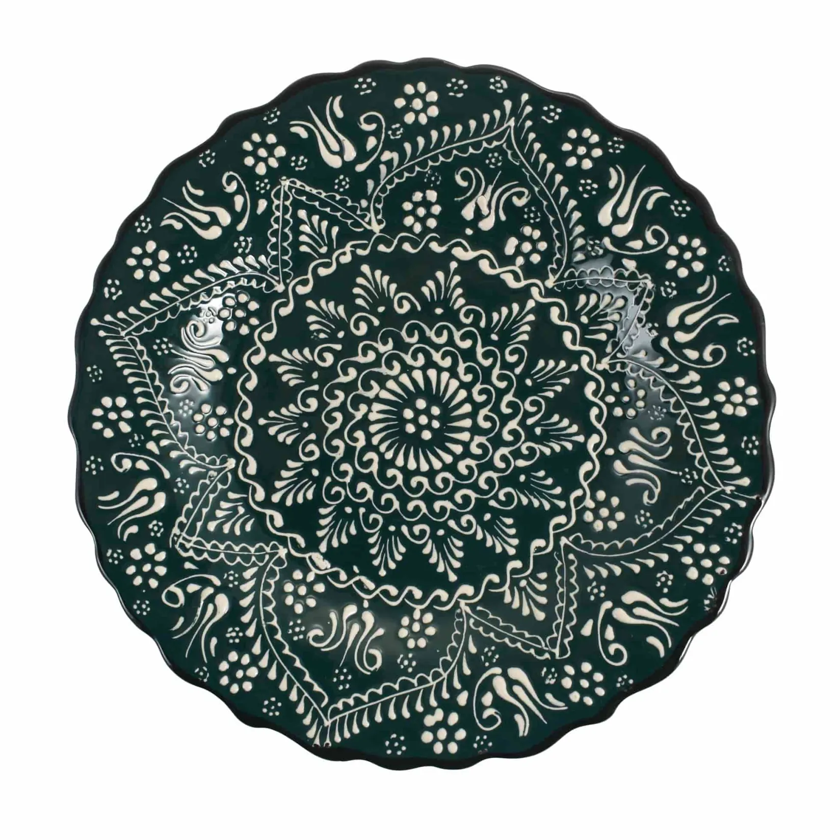 Use this patterned dinner plate to serve chicken shish or harissa roast sea bream. Made in Turkey, it has wavy sides and an intricate hand-painted design.