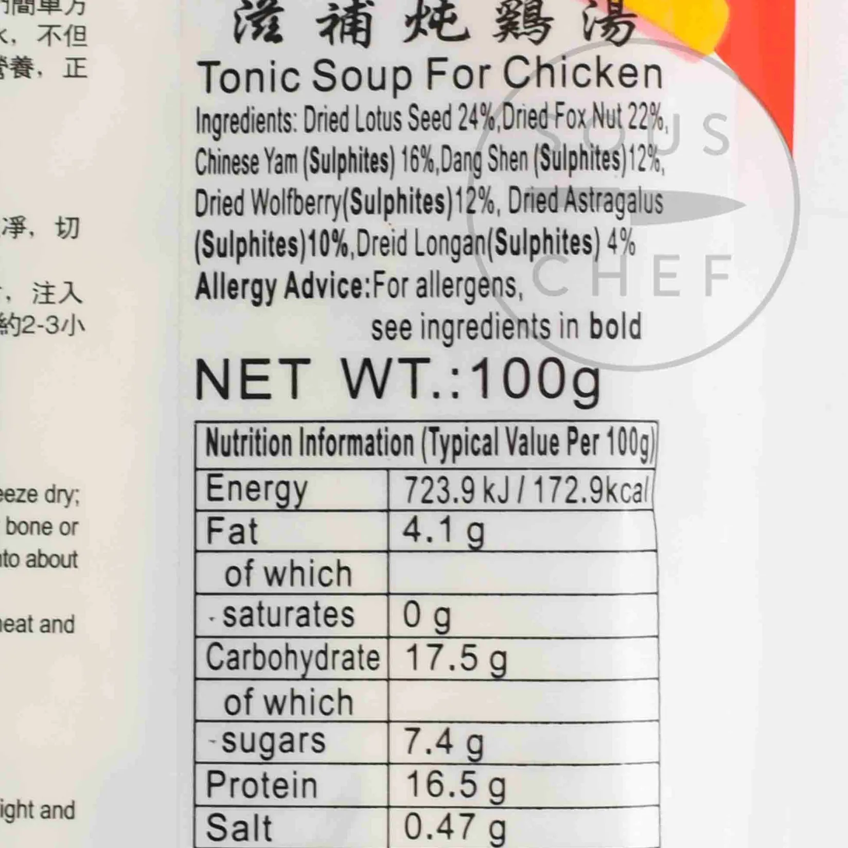 Tonic soup for chicken is a blend of traditional Chinese herbs. It is used to flavour a slow-cooked chicken soup.