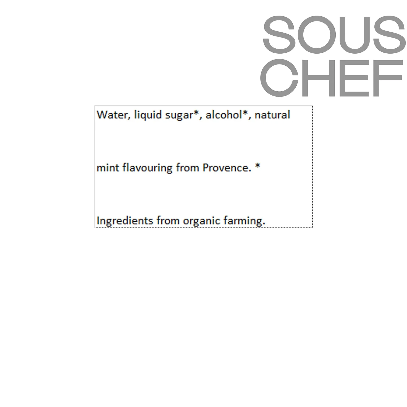 Product formulations and details may change. For the latest ingredients and allergen information always check product packaging prior to consumption. Ingredients: Water, liquid sugar*, alcohol*, natural mint flavouring from provence.