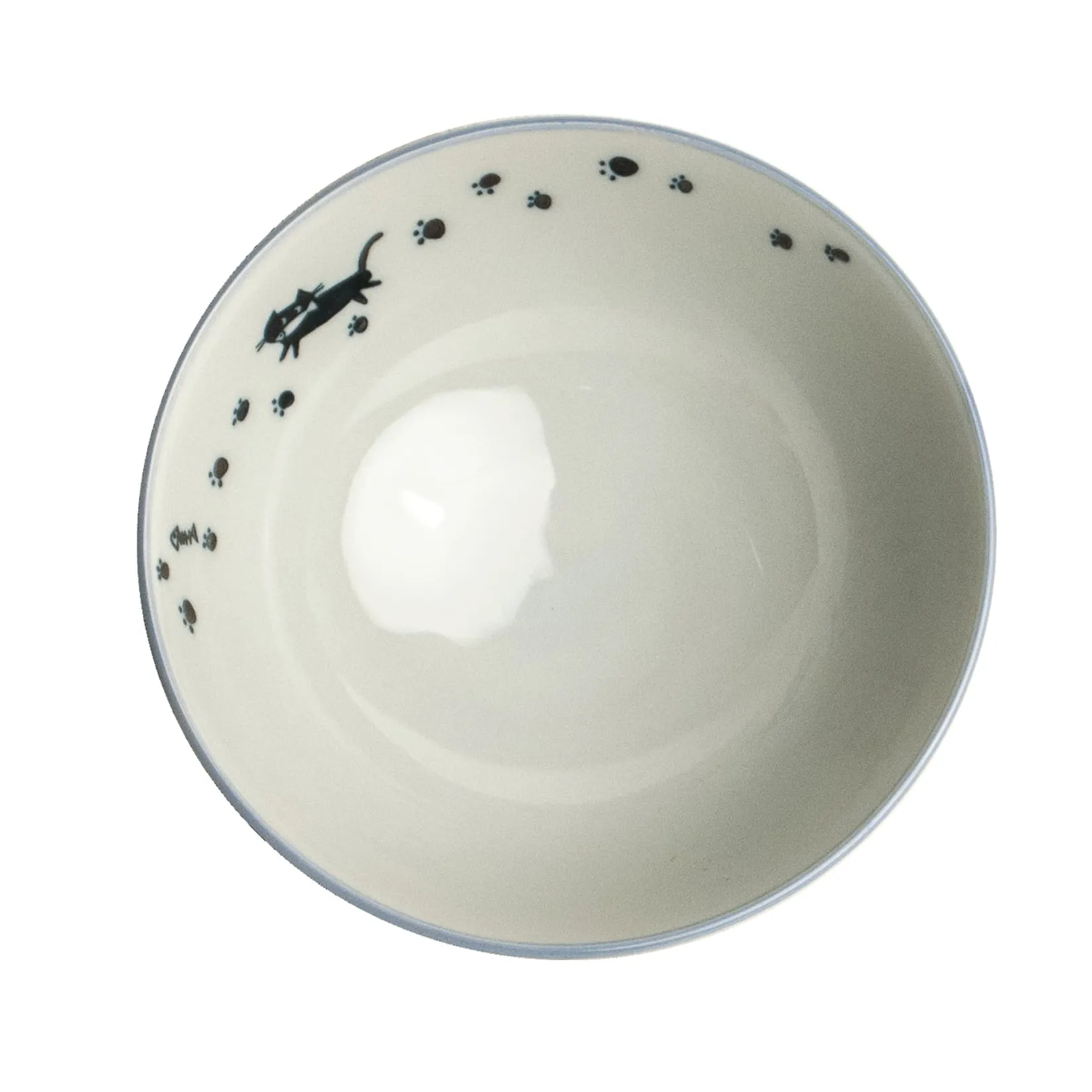 The small white bowl has a dark blue base and rim. It’s decorated with blue cats leaving a trail of dainty footprints. The playful design will delight animal lovers of all ages.