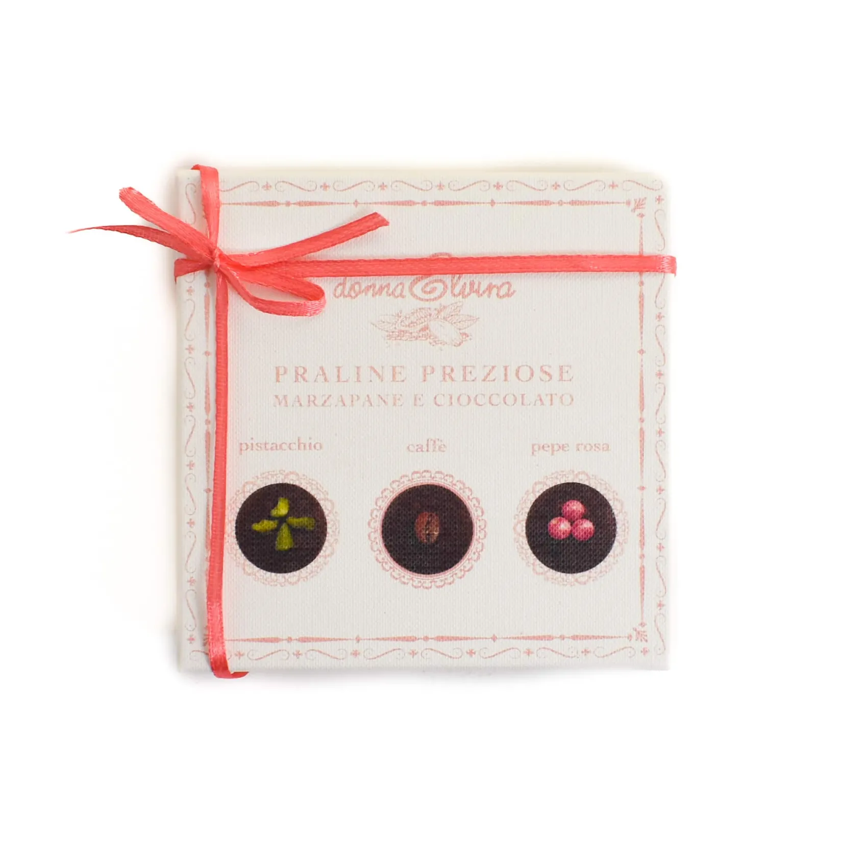 Donna Elvira chocolate is made with two ingredients: cocoa and cane sugar. It has a pure, natural flavour and bittersweet finish. If you like your chocolate dark and intense, these pralines are sure to impress.
