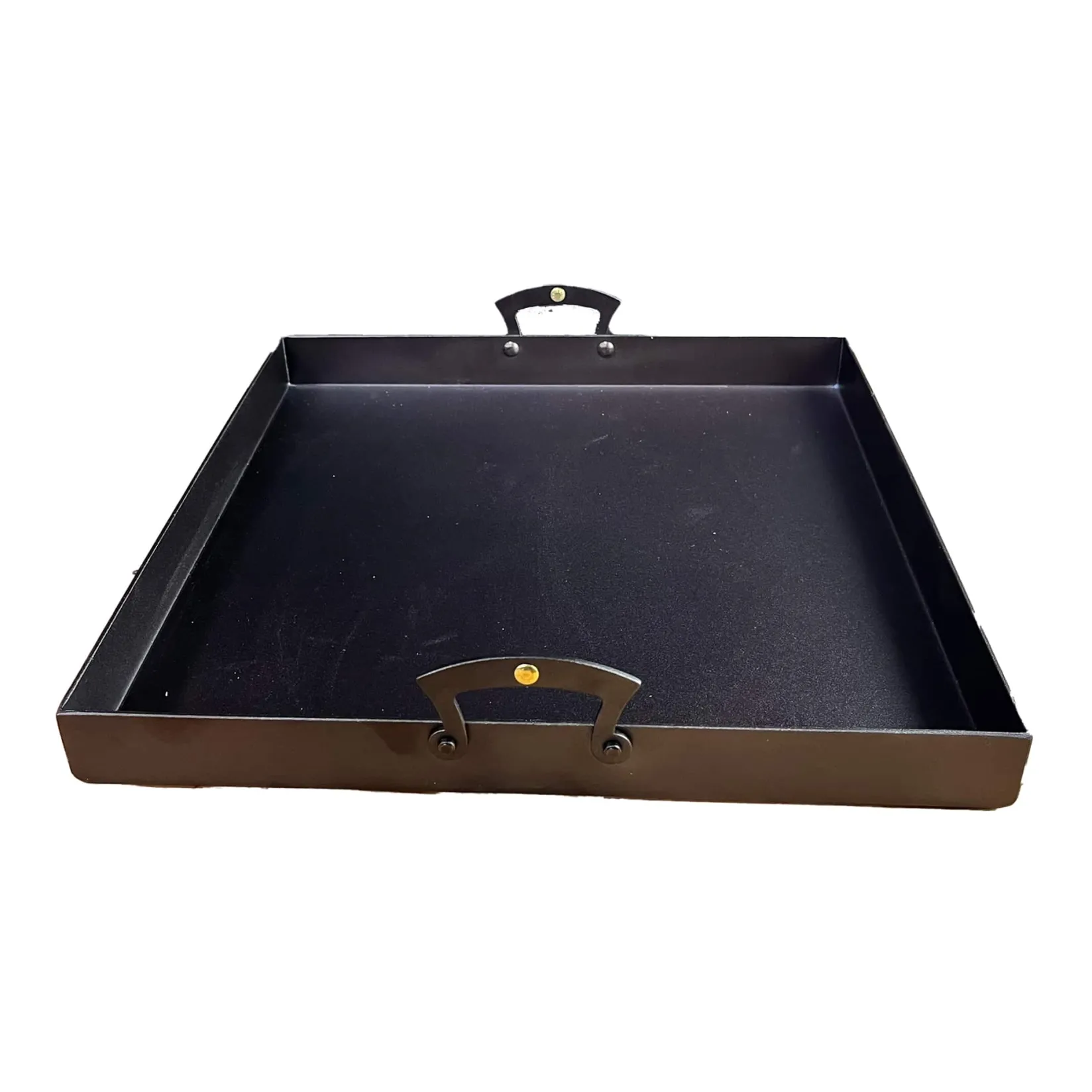 The tray can be used on the hob, under the grill and in the oven. It’s suitable for induction hobs, as well as barbecues, open fires and wood burning ovens. Cook indoors or outdoors, then carry the tray straight to the table. Sturdy riveted handles make it easy to lift and transport.
