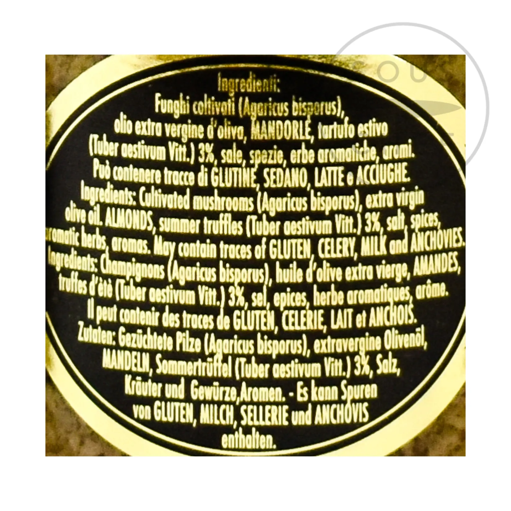 Product formulations and details may change. For the latest ingredients and allergen information always check product packaging prior to consumption. Ingredients: Cultivated mushrooms (agaricus bisporus), sunflower oil, summer truffles (tuber aestivum vitt) 5%, salt, spices, aromatic herbs, almonds, lemon juice, aroma. Contains nuts. May contain traces of gluten, milk, and anchovies.