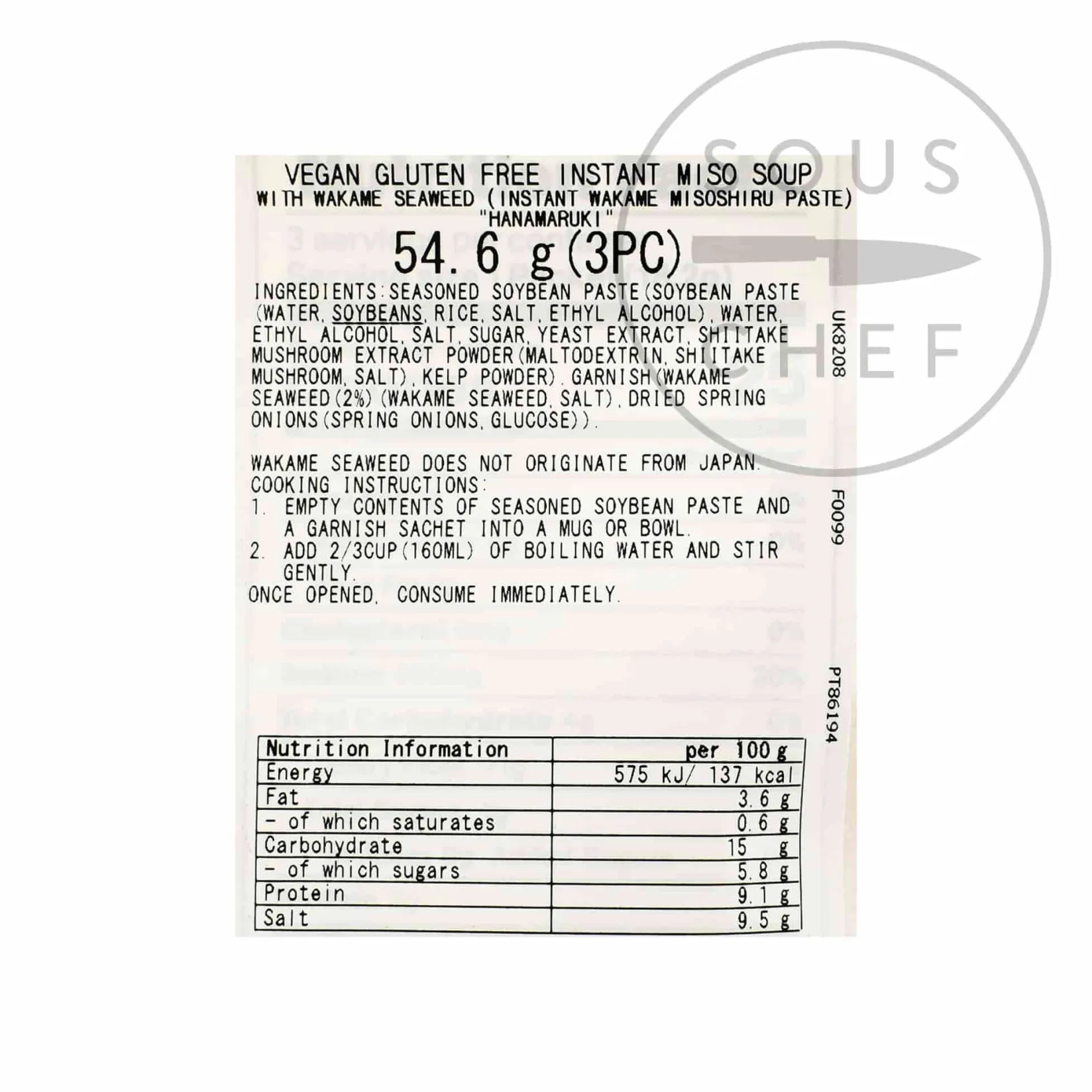 Product formulations and details may change. For the latest ingredients and allergen information always check product packaging prior to consumption. Ingredients: Seasoned soybean paste (soybean paste (water, soybeans, rice, ethyl alcohol), water, ethyl alcohol, salt, sugar, yeast, extract, shiitake mushroom extract powder (maltodextrin, shiitake mushroom, salt), kelp powder), garish (wakame seaweed 2%) (wakame seaweed, salt), dried spring onions (spring onions, glucose).