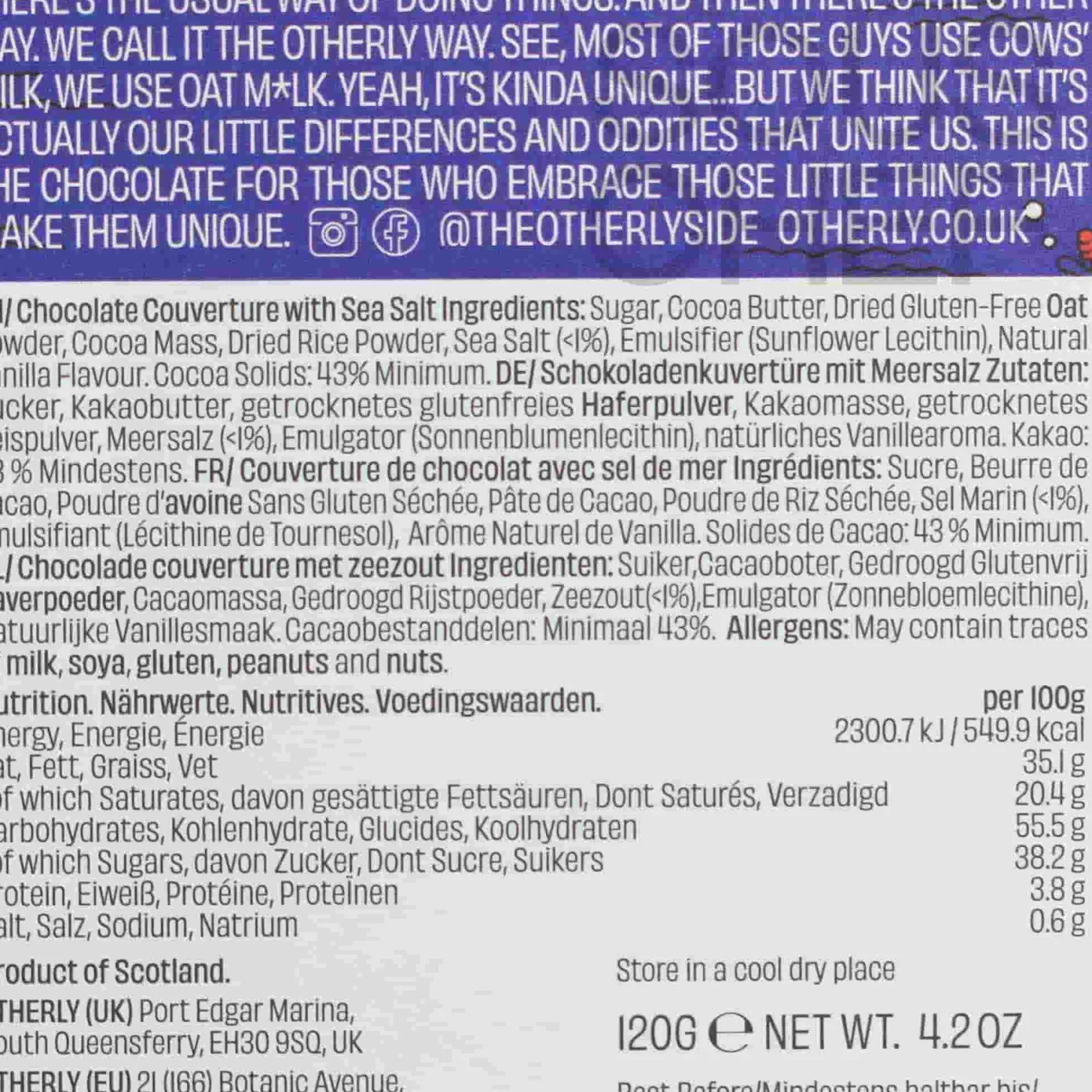 Product formulations and details may change. For the latest ingredients and allergen information always check product packaging prior to consumption. Ingredients: Sugar, cocoa butter, dried gluten-free oat powder, cocoa mass, dried rice powder, sea salt (<1%), emulsifier (sunflower lecithin), natural vanilla flavour. Cocoa Solids: 43% Minimum.