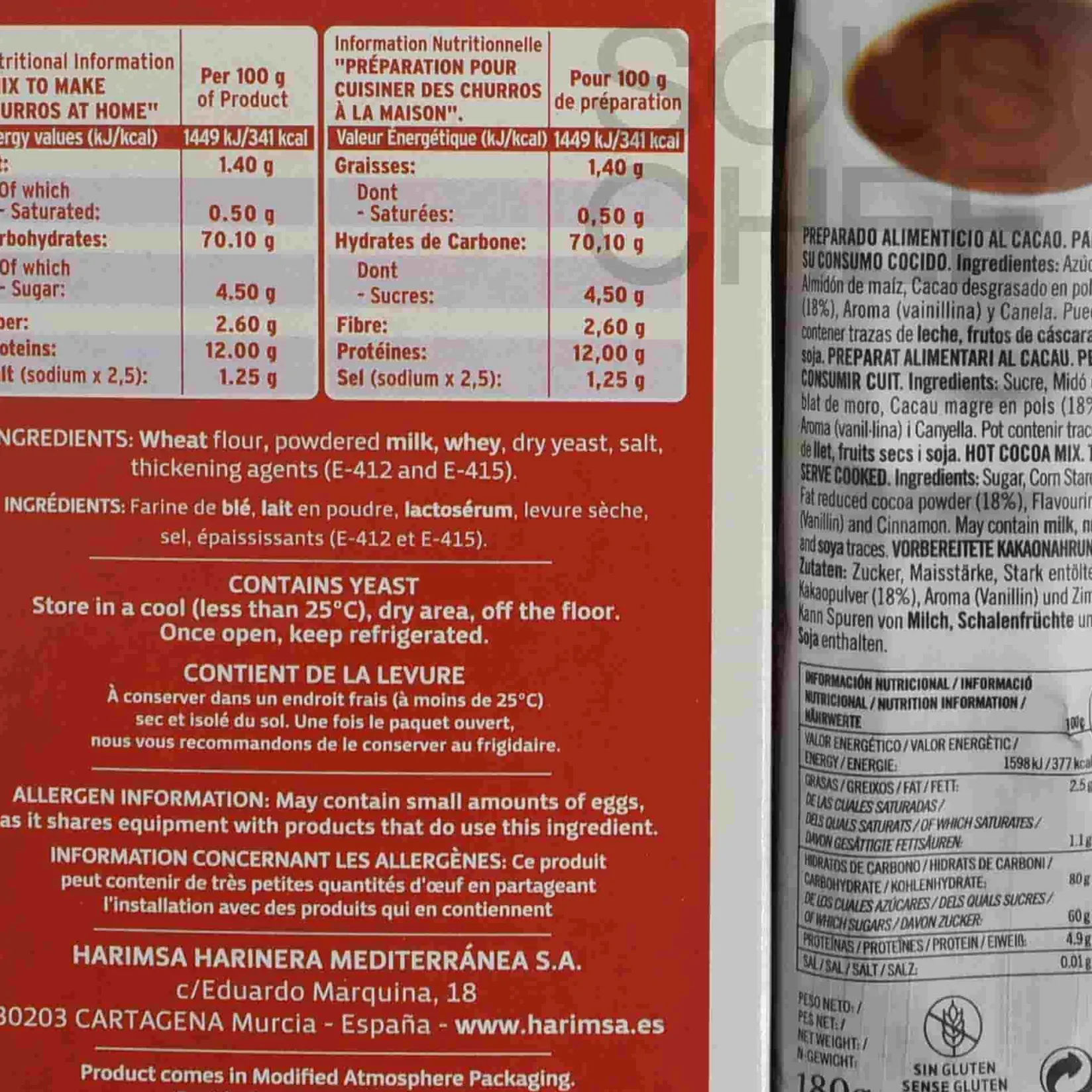 Product formulations and details may change. For the latest ingredients and allergen information always check product packaging prior to consumption. Ingredients: Hot chocolate: sugar, fat reduced cocoa powder, corn starch, flavouring: vanilla and cinnamon. churro mix: wheat flour, powdered milk, whey protein, dry yeast, thickening agents: e412, e415 and e491
