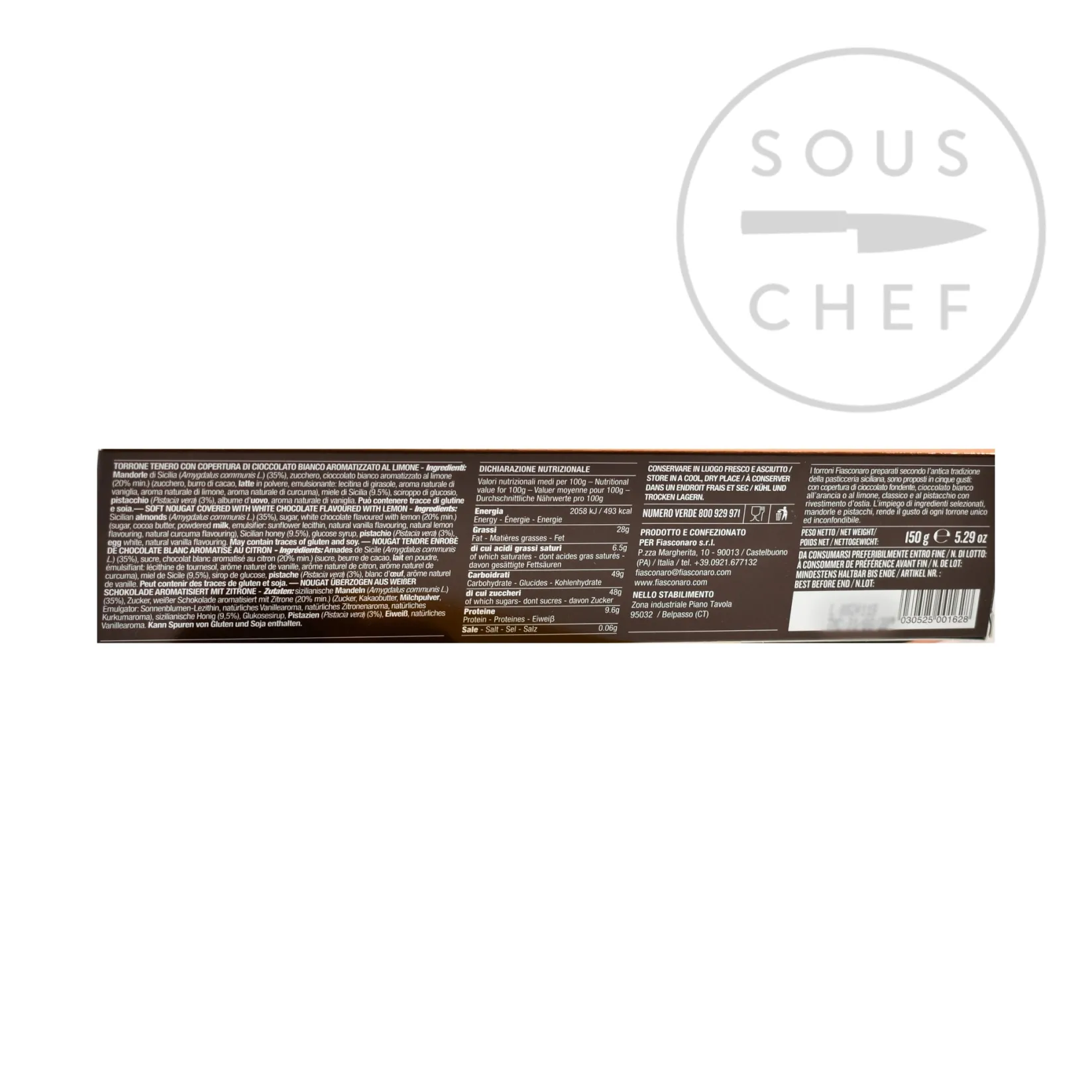 Product formulations and details may change. For the latest ingredients and allergen information always check product packaging prior to consumption. Ingredients: Sicilian almonds (Amygdalus communis L.) (35%), sugar, White chocolate coating with lemon (min. 20%) (sugar, cocoa butter, powdered milk, emulsifier: sunflower lecithin, natural vanilla flavouring, natural lemon flavouring, natural curcuma flavouring). Sicilian honey (9.5%), glucose syrup, pistachio (Pistacia vera) (3%), egg white, natural vanilla flavouring. Allergens are listed in bold. May contain traces of gluten and soy.