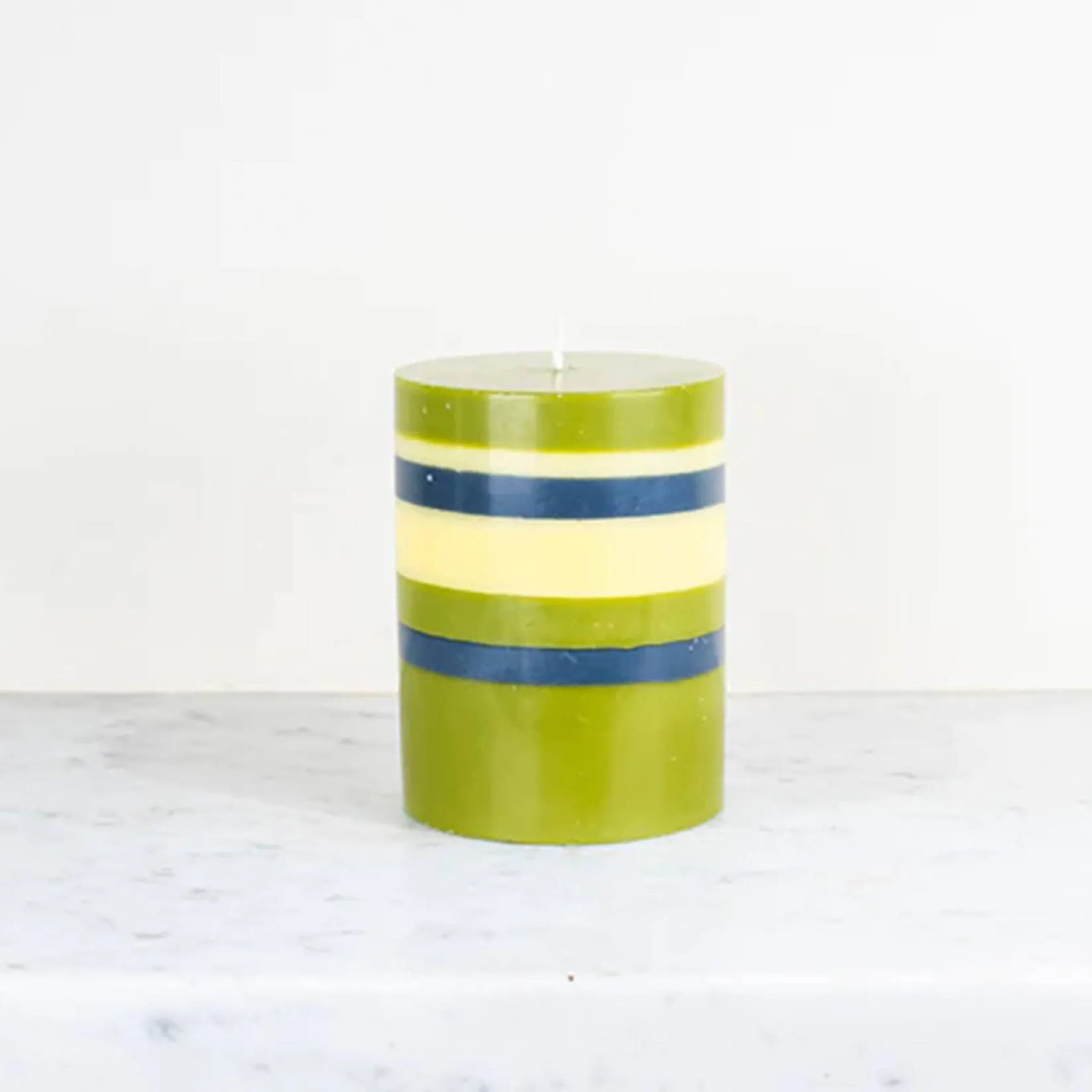 This striped pillar candle in olive and navy is an elegant addition to your candle collection. Designed by British Colour Standard, it is made with high quality eco dyes to produce vibrant shades that will brighten up your mantelpiece or coffee table. This 10cm candle will burn for up to 36 hours with almost no smoke or soot.