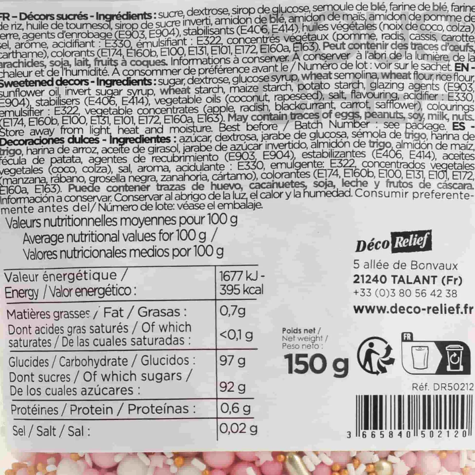 Adorn cakes and cookies with Déco Relief’s pink and gold decorating mix. Sweet and crunchy, it adds a touch of sparkle to all your creations. Use them to transform simple bakes into show-stopping delights for birthdays and baby showers.