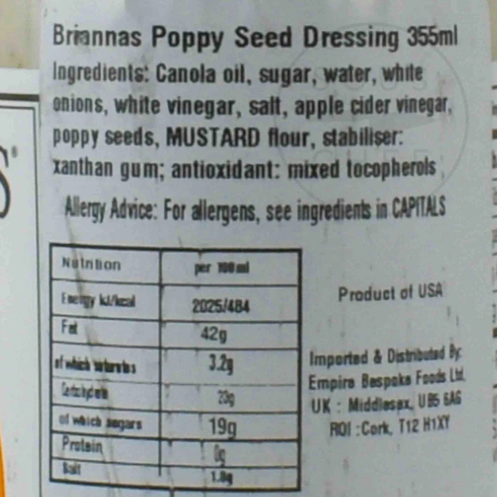 Product formulations and details may change. For the latest ingredients and allergen information always check product packaging prior to consumption. Ingredients: Canola oil, sugar, water, white onions, white vinegar, salt, apple cider vinegar, poppy seeds, mustard flour, stabiliser: xanthan gum; antioxidant: mixed tocopherols