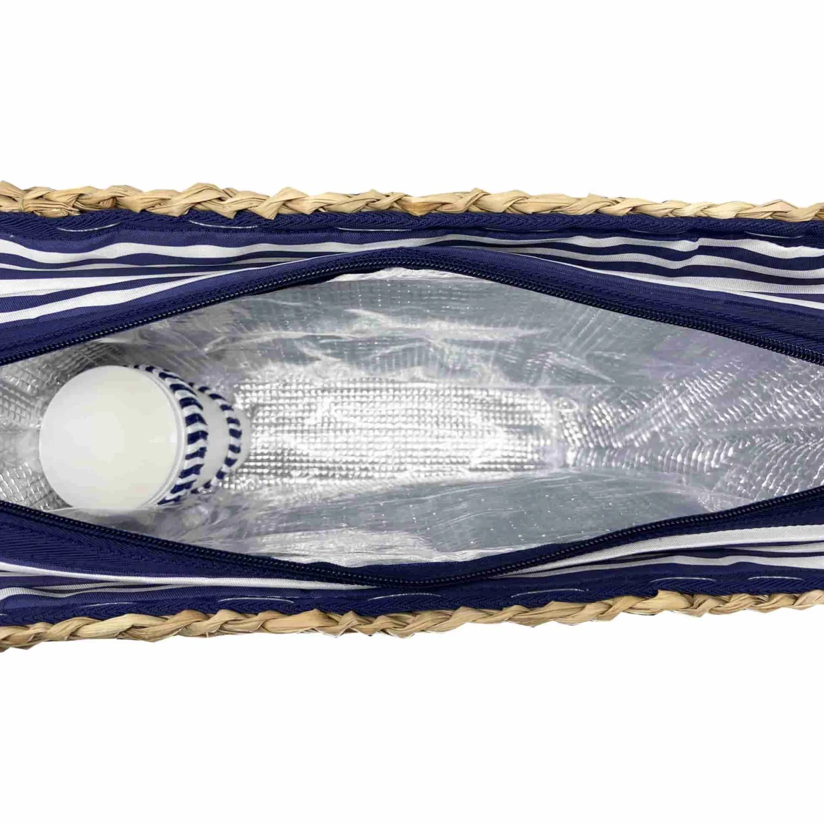 The Sac de Plage picnic tote in Riviera blue is an elegant way to carry food and drink to the beach. The spacious raffia bag has blue and white striped lining and an insulated compartment to keep food and drink cool. Inside, you’ll find four plates, glasses, a corkscrew and a set of bamboo cutlery in a smart blue case.