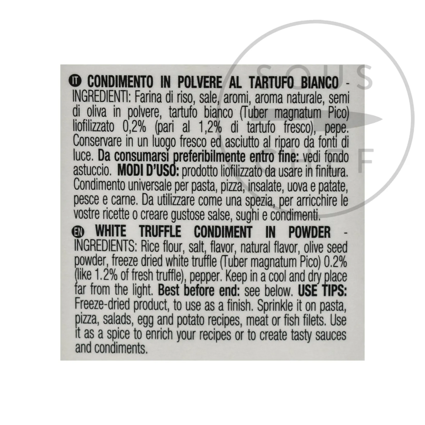 White truffle powder is a punchy condiment to sprinkle over bowls of buttered spaghetti, grilled cheese sandwiches and savoury soufflés. Freeze dried white truffle is mixed with salt and pepper to create a handy jar of truffle seasoning, perfect for finishing off dishes just before serving.