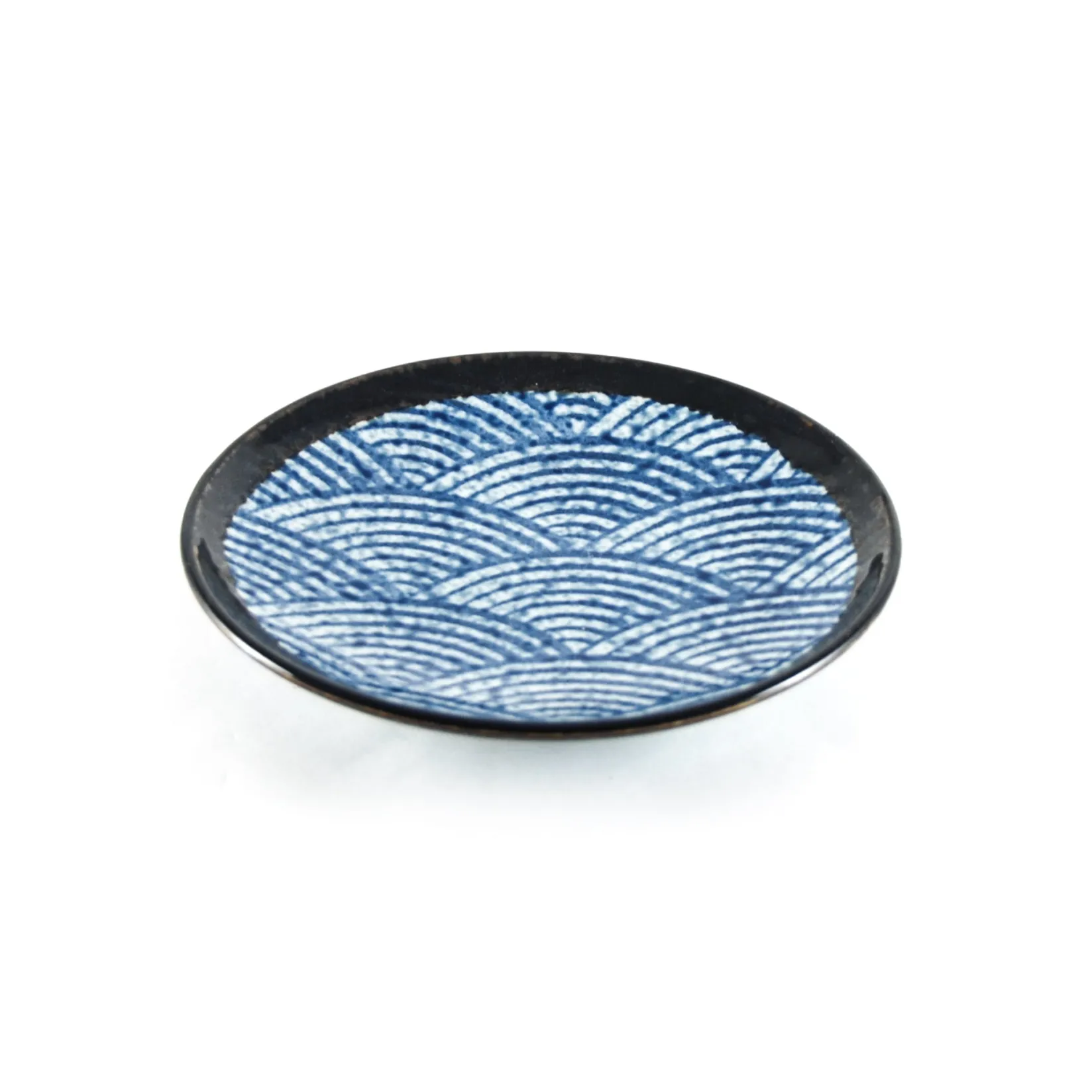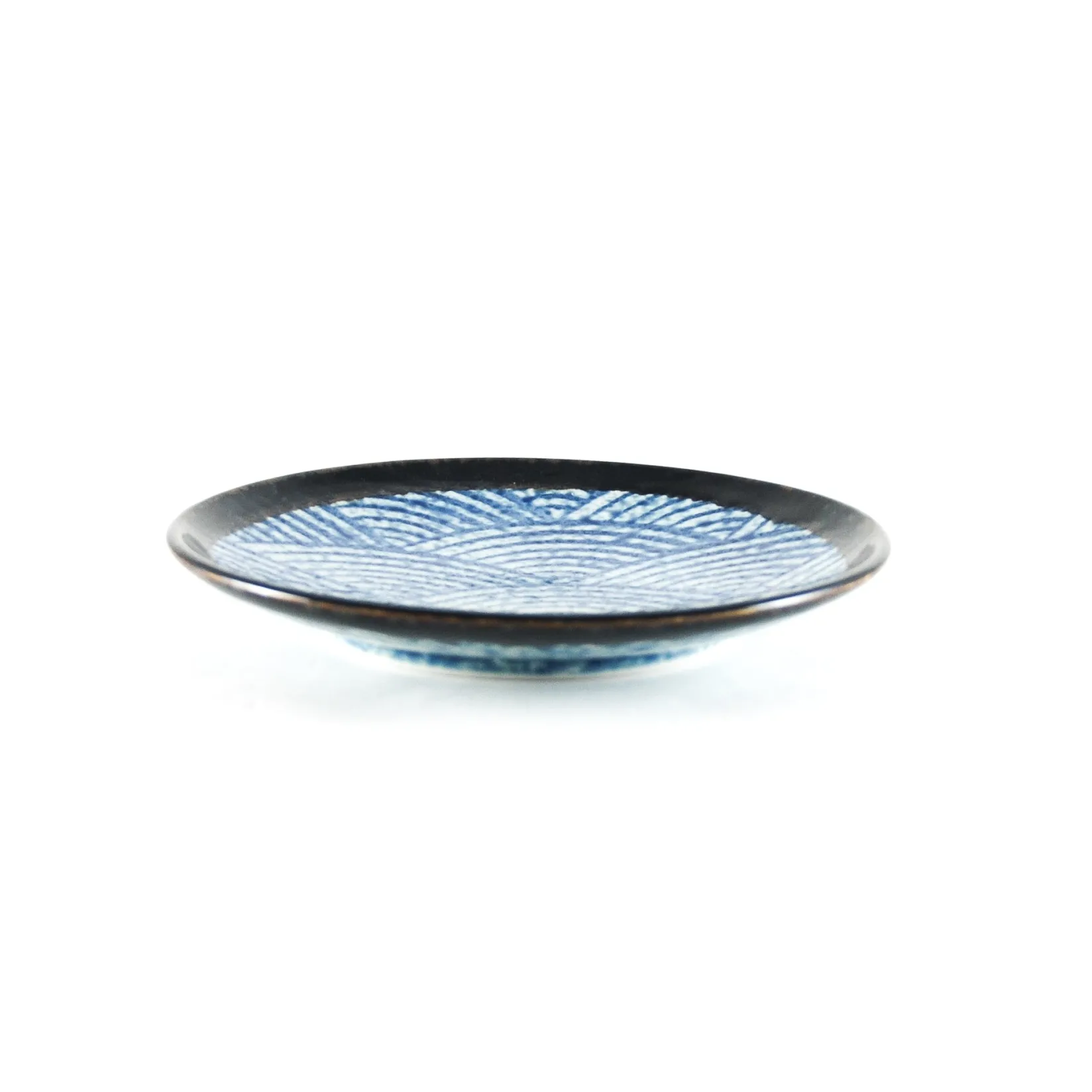 The round side plate is decorated with a textured white and blue glaze in a stylised wave pattern. The plate is finished with a glossy brown-black border.