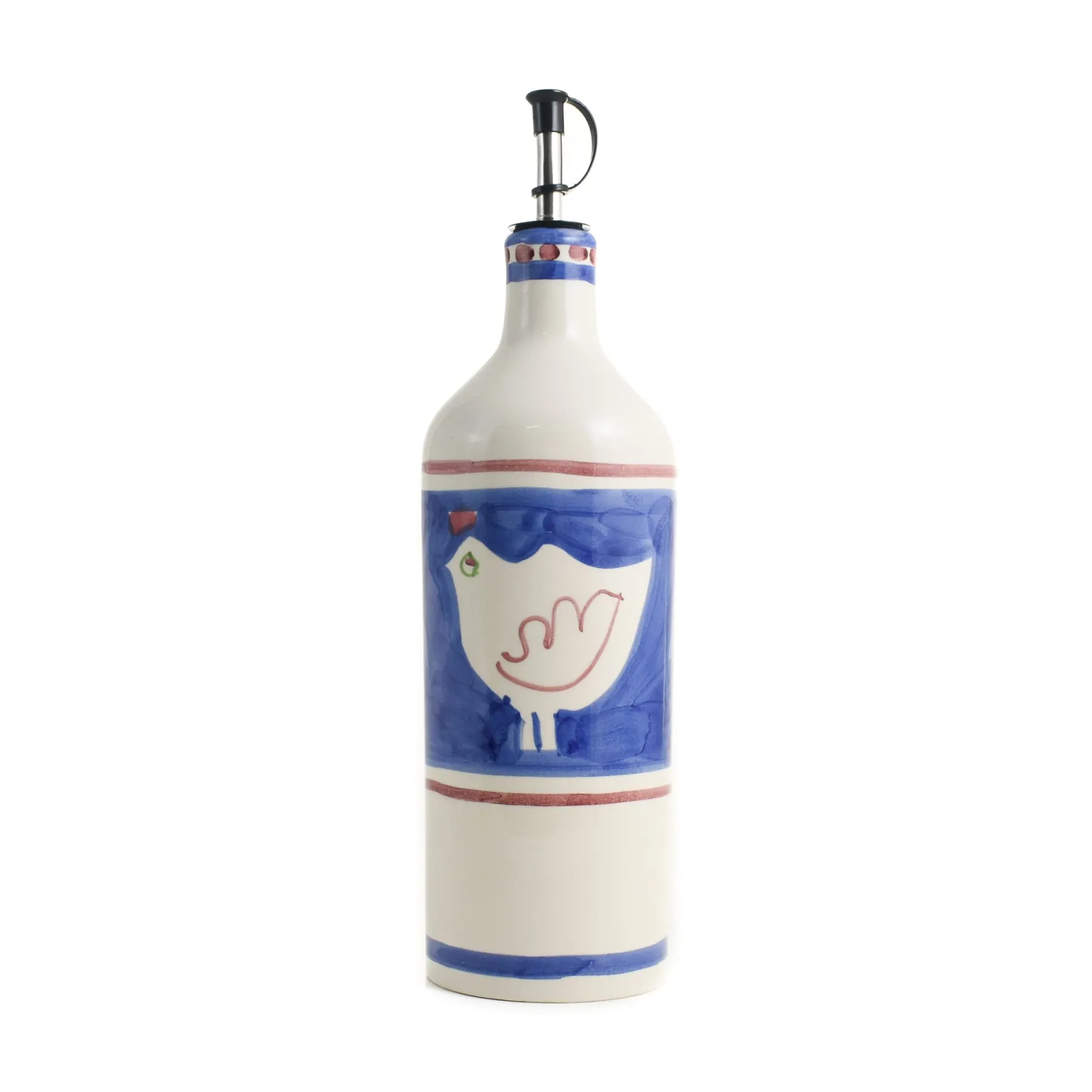 The white bottle features a blue stripe decorated with white chickens. With irregular brushstrokes and delicate dot detail, no two bottles are the same. The slender pouring spouts lets you direct oil over salads or into your pan.