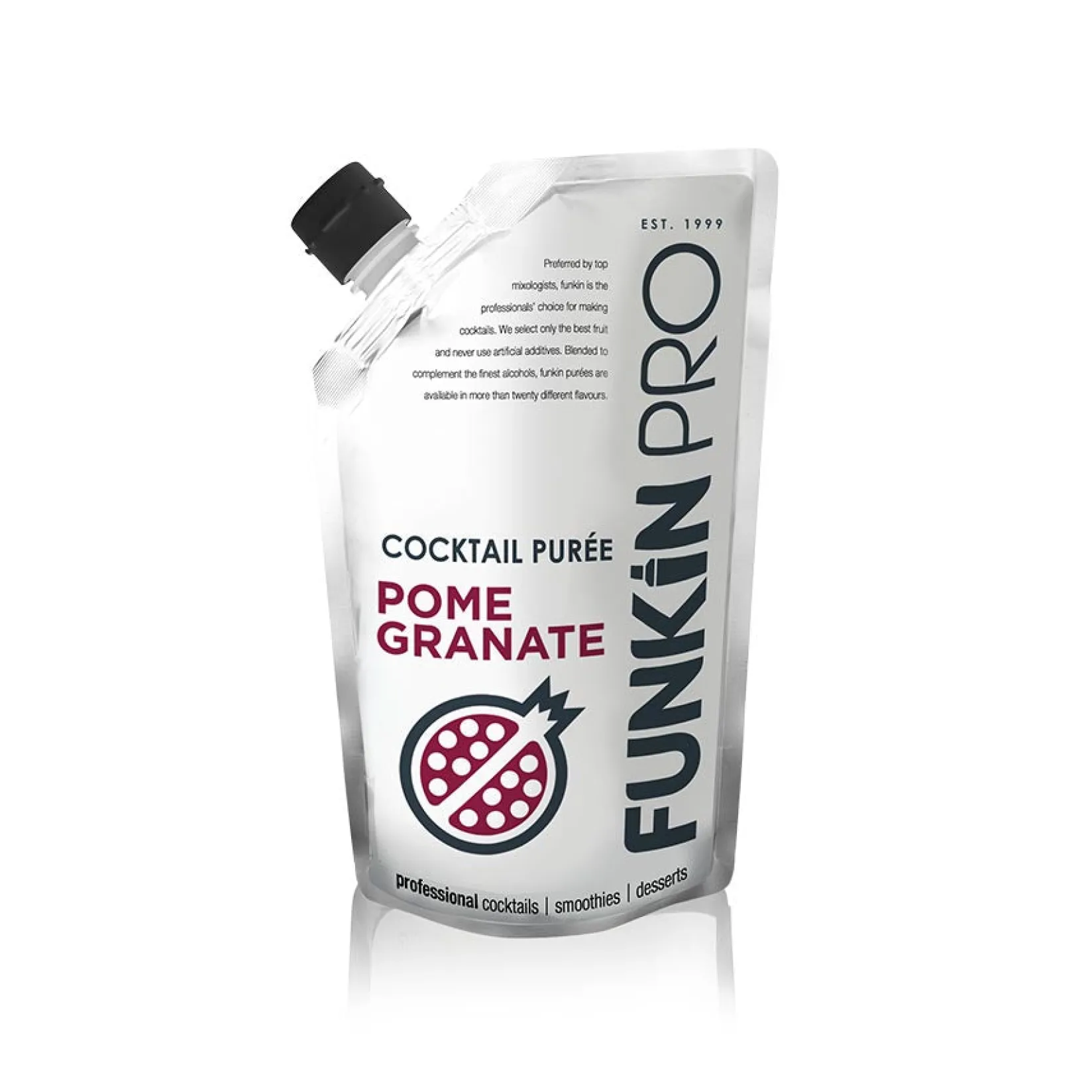Funkin purees contain only the best fruit from around the world – no artificial colours, flavours, preservatives or additives. This pomegranate puree has a sweet flavour with a familiar astringent note. The purees come in a pourable pouch with a re-sealable screw top lid for easy cocktail making.