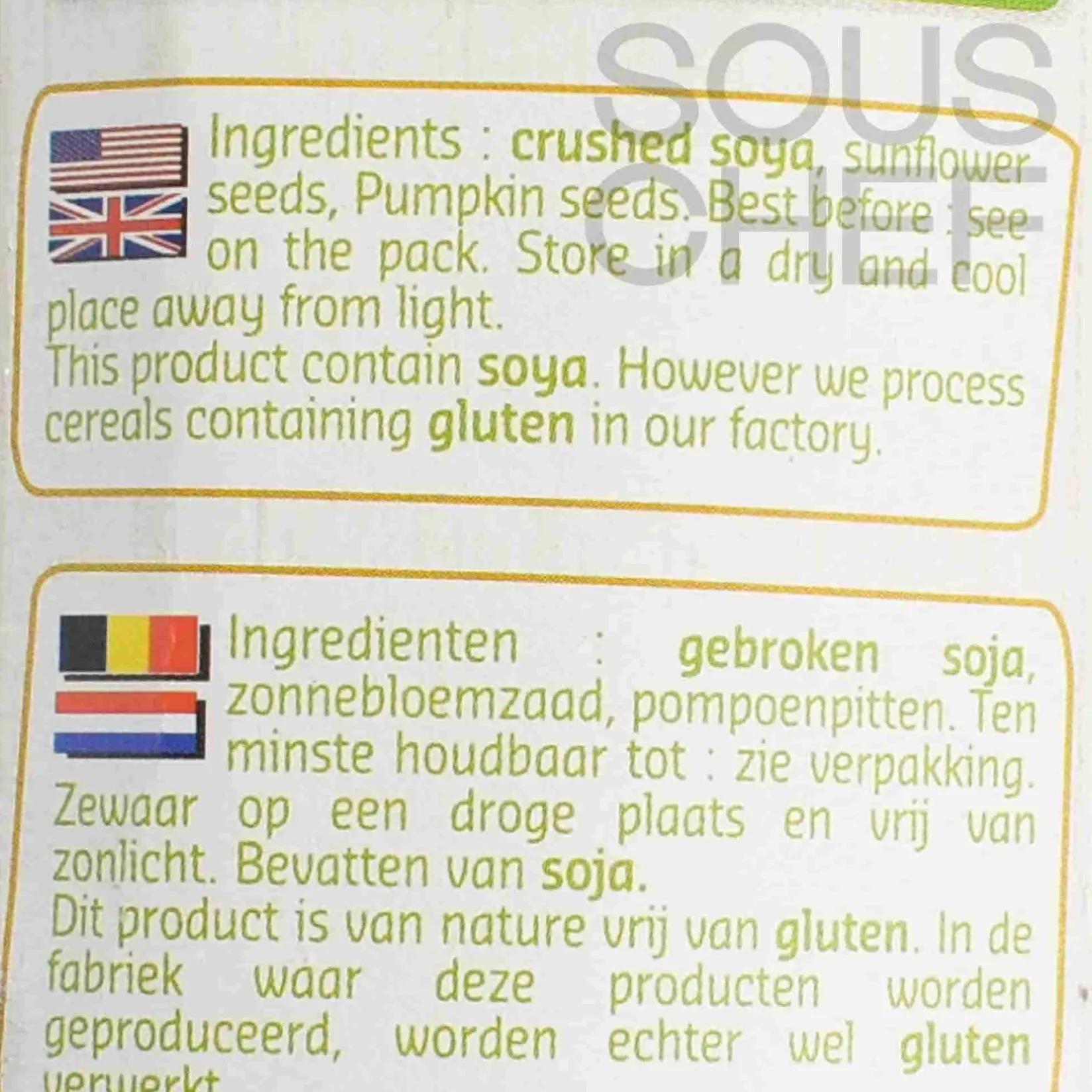 Product formulations and details may change. For the latest ingredients and allergen information always check product packaging prior to consumption. Ingredients: 40% organic crushed soybeans, 40% organic sunflower seeds, 20% organic pumpkin seeds