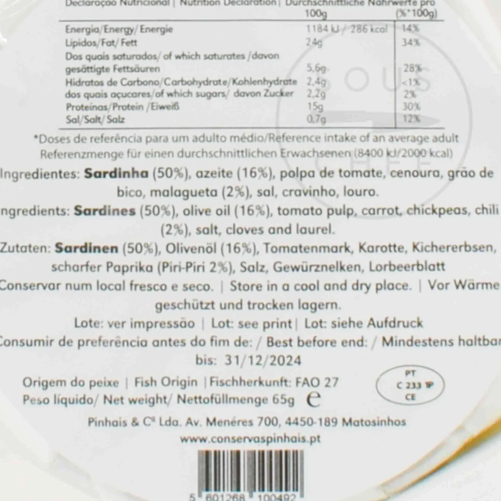 Product formulations and details may change. For the latest ingredients and allergen information always check product packaging prior to consumption. Ingredients: Sardines (50%), olive oil (16%), tomato pulp, carrot, chickpeas, chilli (2%), salt, cloves and laurel