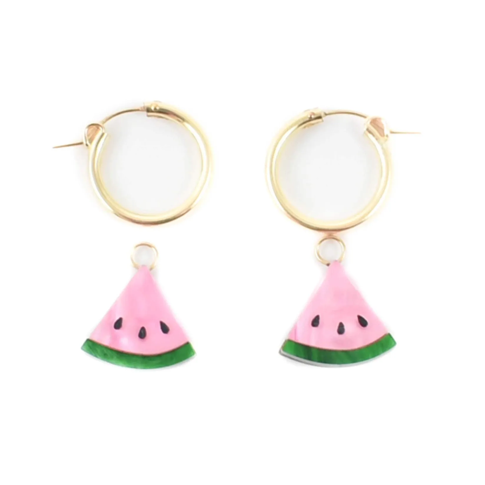 These handcrafted watermelon hoop earrings are perfect for beach parties and summer holidays. Designed to look like juicy wedges of watermelon, each charm is made from FSC-certified wood with delicate hand-inked details. Suspended from gold-filled hoops, the hot pink and bright green charms will add a pop of colour to any outfit.
