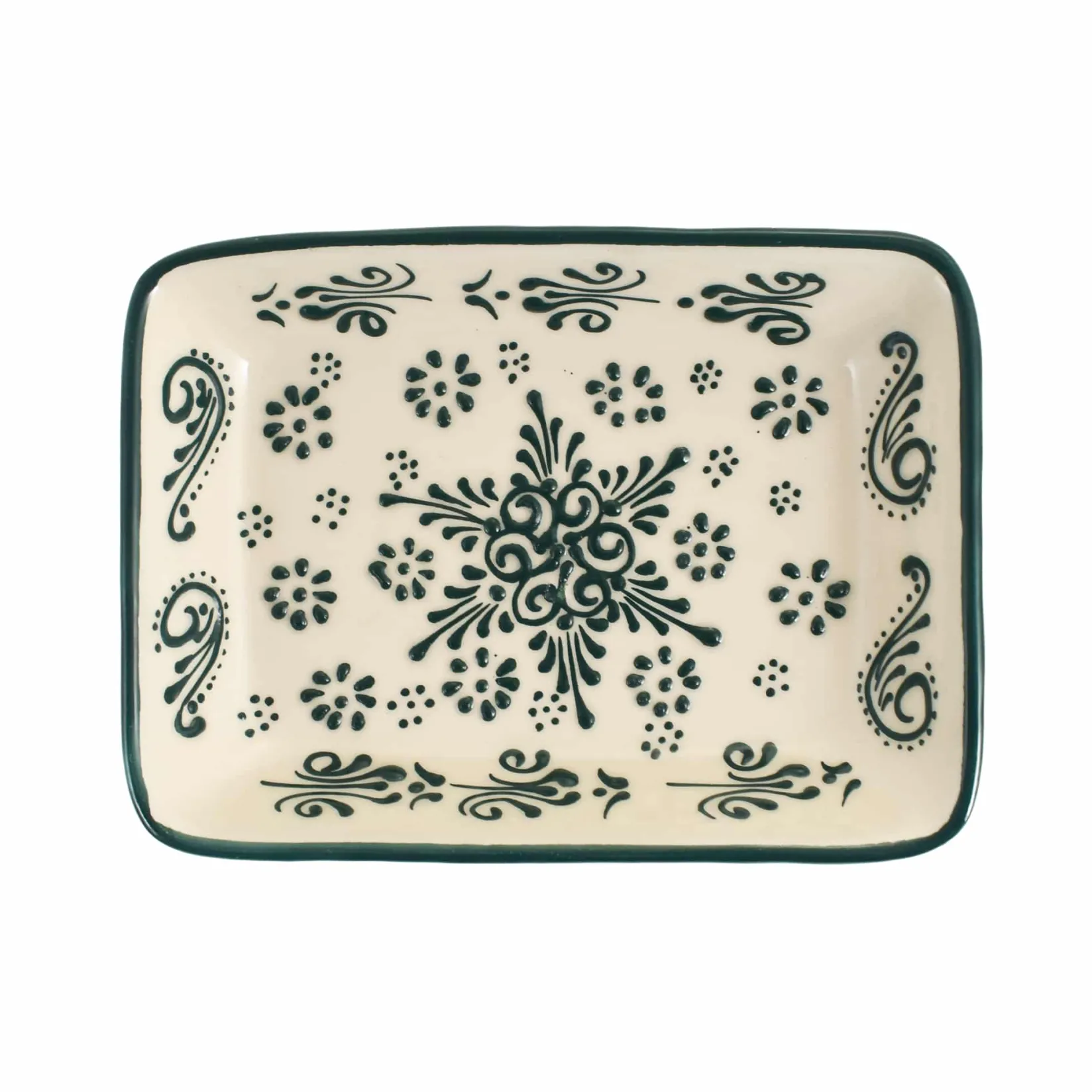 This stylish serving platter is made in Turkey and features a traditional design. The deep green colour of the intricate pattern is sure to stand out on your table.