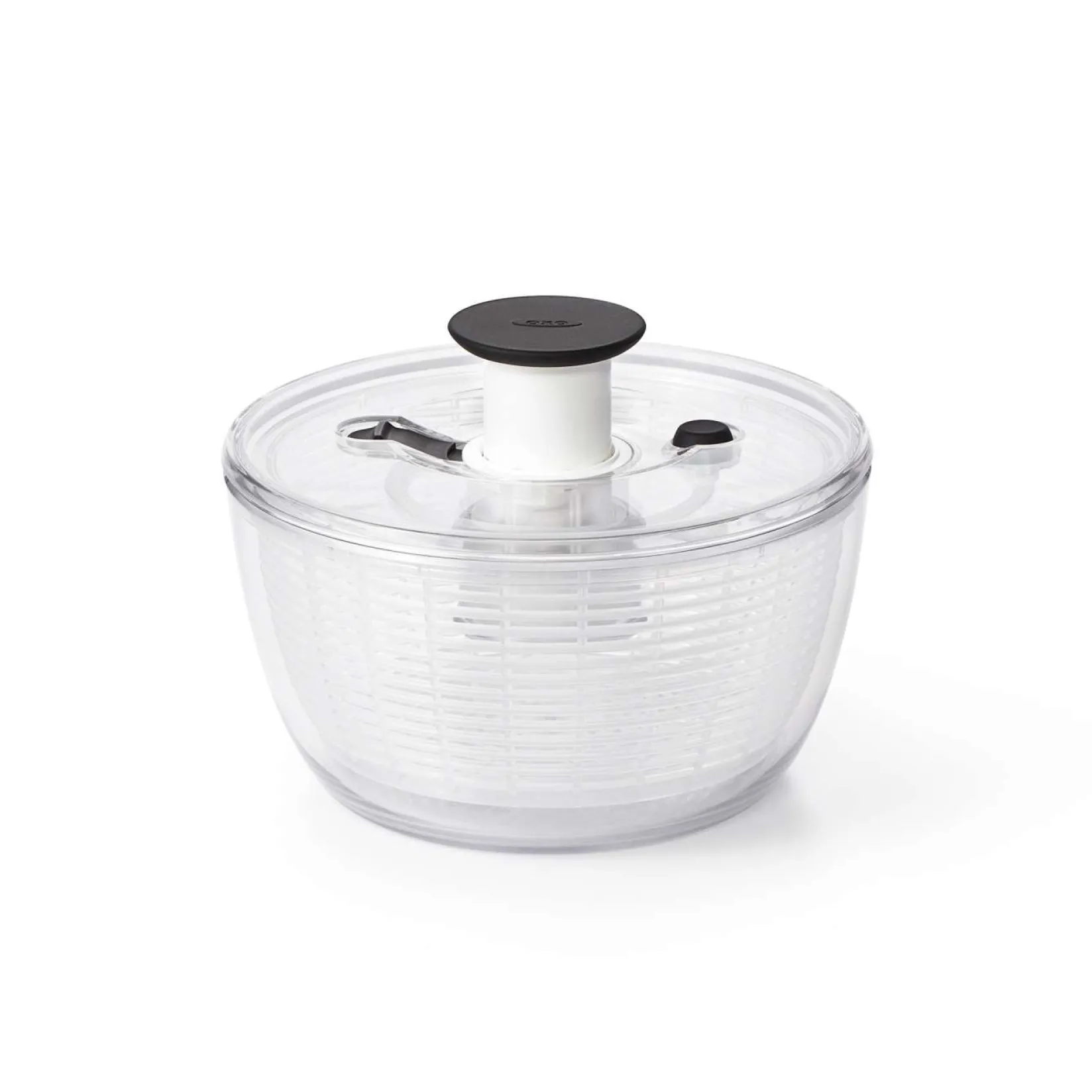 The OXO Good Grips little salad & herb spinner is the fast and easy way to dry herbs and salad leaves. Just a few presses on the plunger spins the central basket at high speed for fast salad prep. Press the ‘brake’ lever in the lid to stop the spinner completely before unloading.