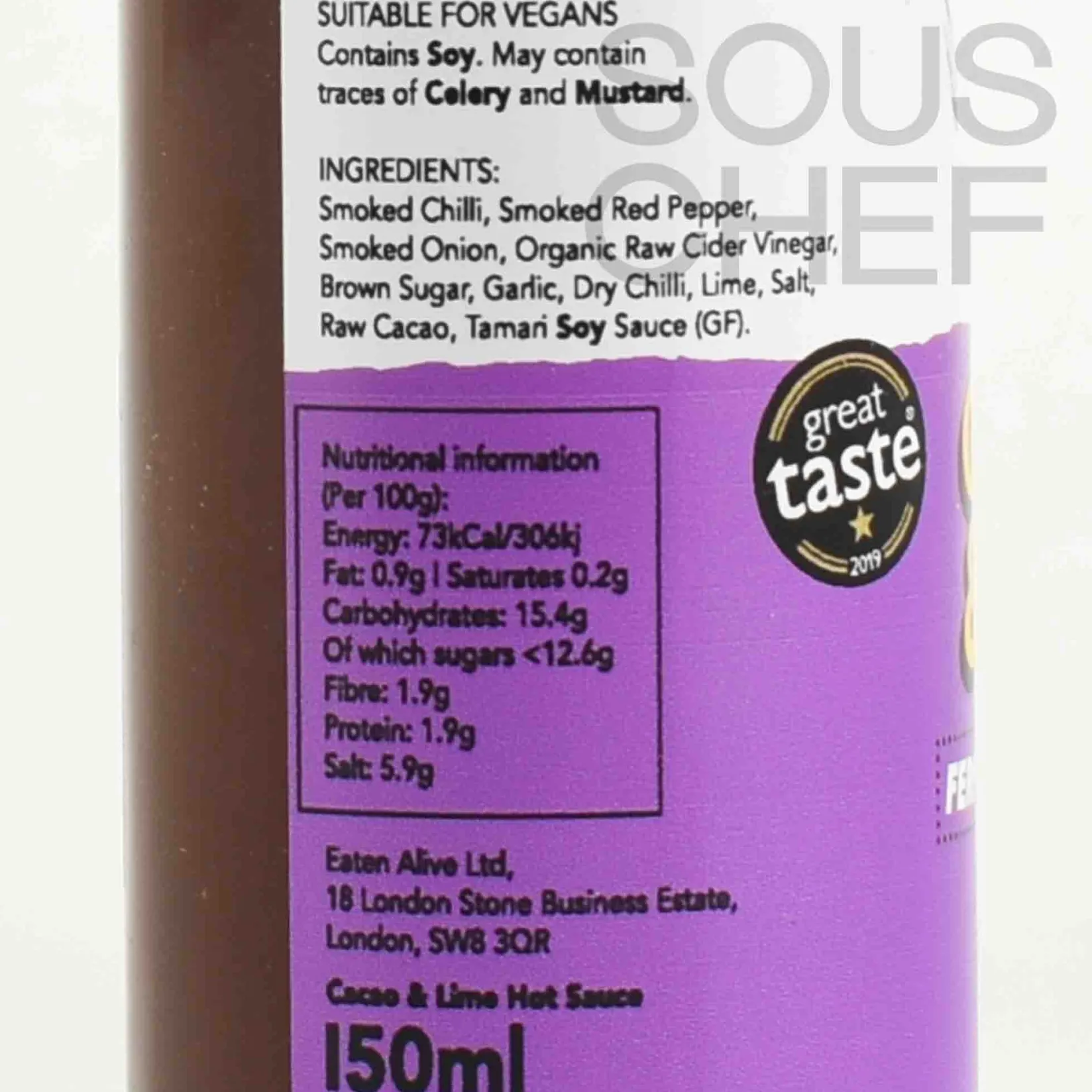 Product formulations and details may change. For the latest ingredients and allergen information always check product packaging prior to consumption. Ingredients: Smoked chilli, smoked red pepper, smoked onion, raw cider vinegar, muscovado sugar, garlic, dry chilli, lime, salt, raw cacao, tamari soy (water, soybean, salt). *denotes organic ingredient.