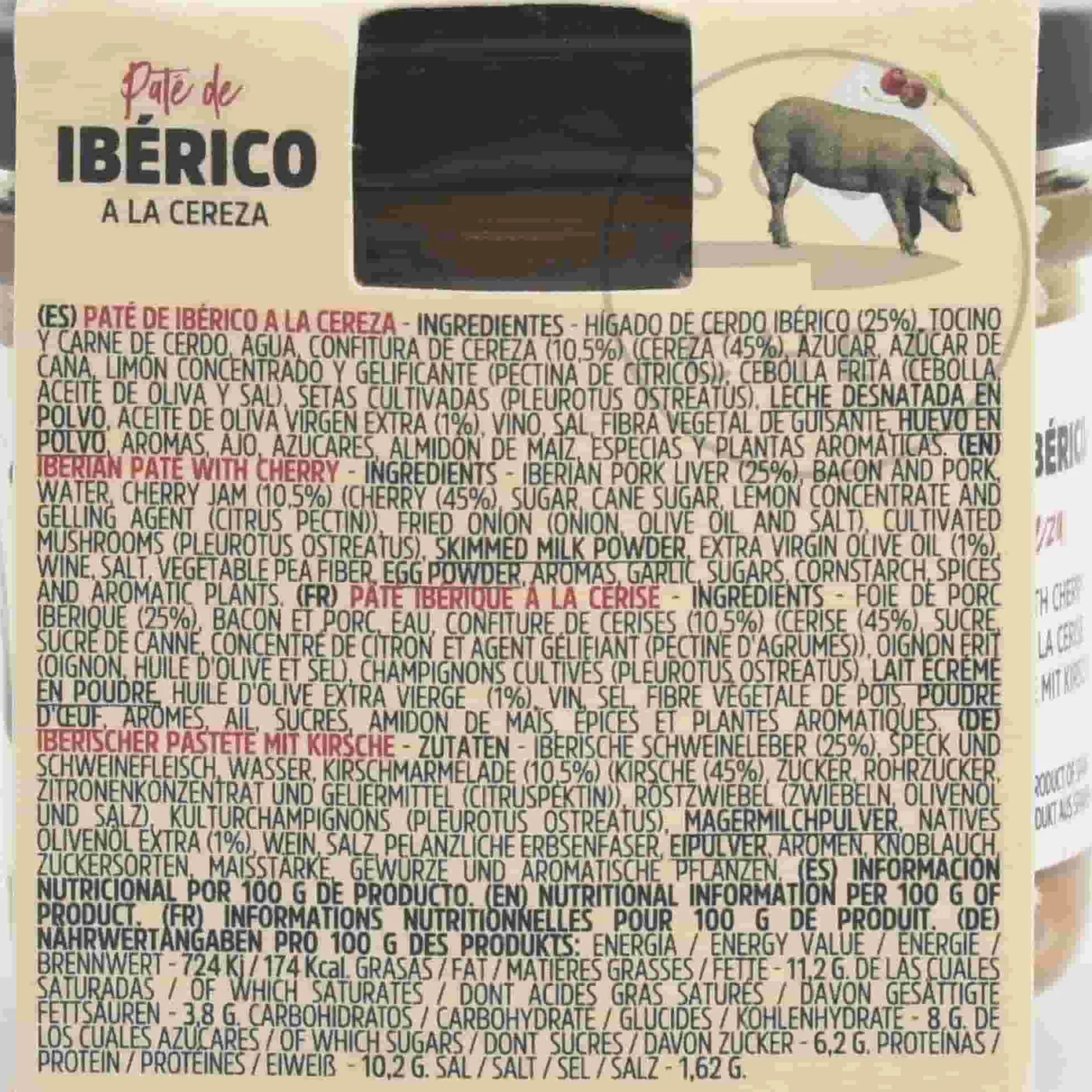 Product formulations and details may change. For the latest ingredients and allergen information always check product packaging prior to consumption. Ingredients: Iberian pork liver (25%), bacon and pork, water, cherry jam (10,5%) (cherry, sugar, cane sugar, lemon concentrate, gelling agent (citrus pectin)), fried onion (onion, olive oil, salt), cultivated mushrooms (pleurotus ostreatus),skimmed milk powder, extra virgin olive oil (1%), wine, salt, vegetable pea fiber, egg powder, aromas, garlic, sugars, cornstarch, spices, aromatic plants.