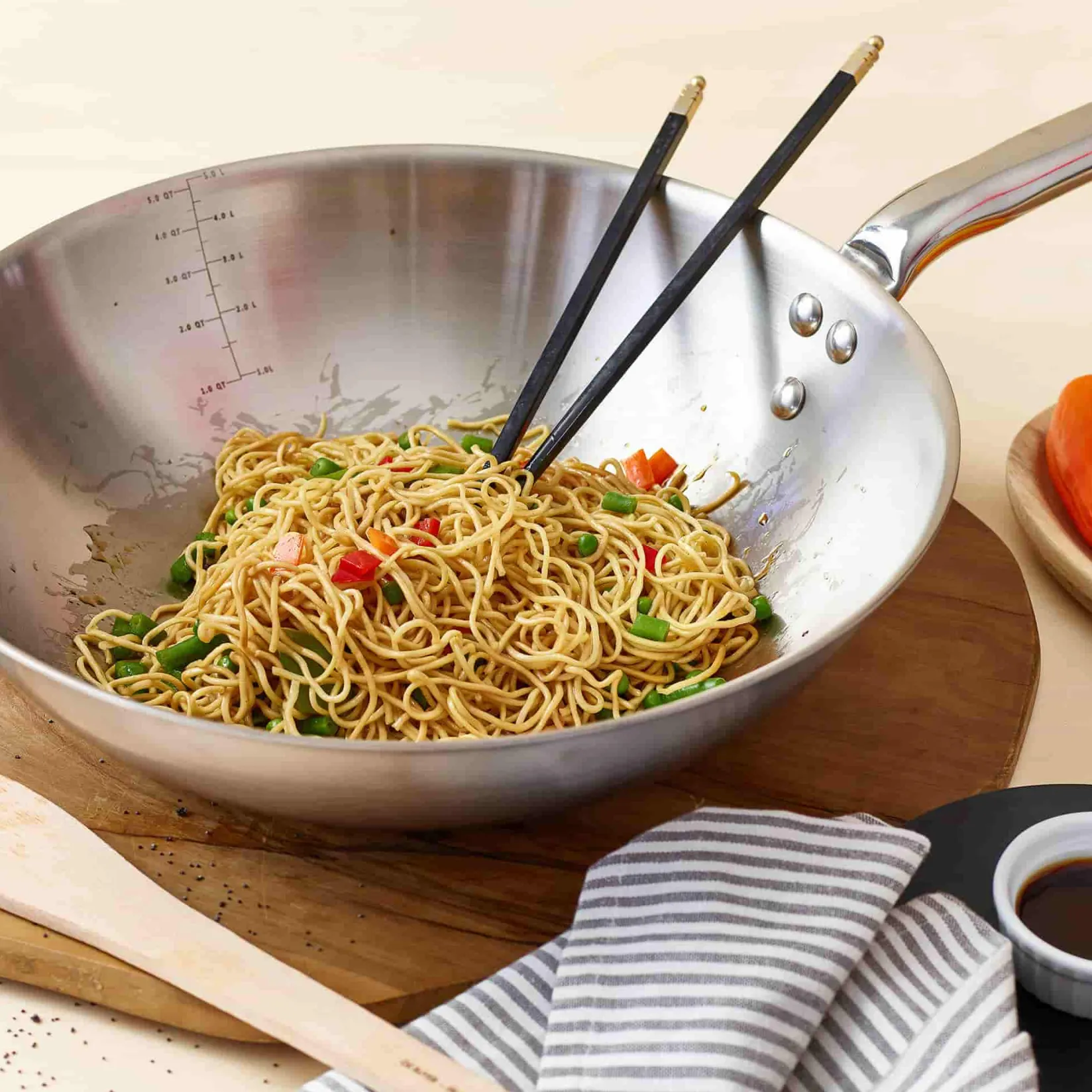 Useful volume marks on the inside of the pan mean you can measure out liquid and cook at the same time. With a brushed finish, this wok is a smart and practical kitchen addition.
